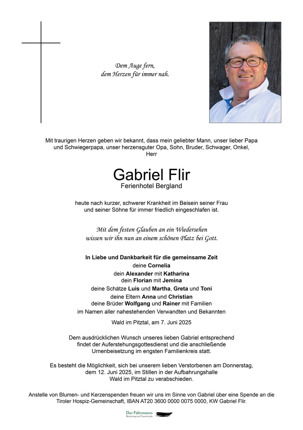 mit tiefer Betroffenheit haben wir vom Tod Eures geliebten Gabrieles erfahren. Nach seiner kurzen, schweren Krankheit hinterlässt er eine große Lücke – aber auch viele wertvolle Erinnerungen, die in Euren Herzen weiterleben werden.
