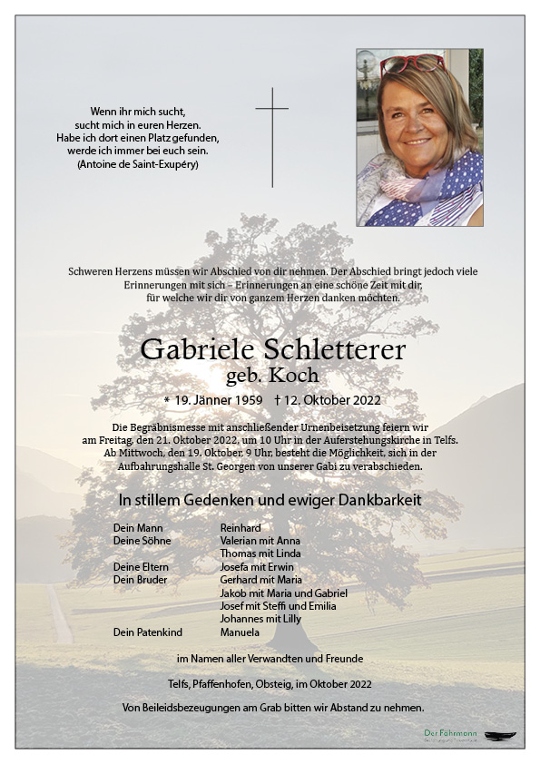 Gabriele hat bei uns in der Montessorischule vor allem als Schulassistenz gearbeitet. Mit ihrer engagierten und schwungvollen Arbeit hat sie bleibende Spuren hinterlassen. Betroffen hören wir von ihrer allzu frühen Reise. Im Vertrauen auf eine große Geborgenheit die über unser Sein und Leben hinausgeht legen wir ihre Seele in Gottes Hand. Den Trauernden sprechen wir unser Mitgefühl und Anteilnahme aus. Wir haben ihr Bild in der Schule aufgehängt, damit sie uns in diesen Tagen nahe ist. Für die Montessorischule Innsbruck Gernot Candolini