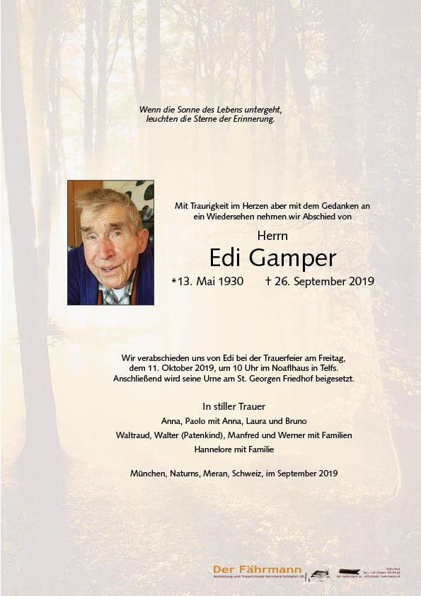 Gamper Eduard 13.05.1930 26.09.2019 Telfs Beisetzungs-Ort: St. Georgenfriedhof Telfs Parte Gedenkkerzen Kondolenzen Parte downloaden Gedenkkerzen für Gamper Eduard 8 Einträge Kerze anzünden Ruhe in Frieden Wolfgang Köck Lieber Onkel wünsch dir eine gute Reise deine Maria A Liachtl für die Reise A Liachtl für die Reise Ruhe in Frieden?! Ruhe in Frieden eine gute Überfahrt Bestattung DER FÄHRMANN Eine Kerze für Gamper Eduard Ihr Name* Ihre Nachricht oder Name* E-Mail-Adresse* Mit dem Klicken auf "Kerze anzünden" erklären Sie sich mit unseren Datenschutzbestimmungen einverstanden. Kondolenzbuch für Gamper Eduard 1 Eintrag Kondolenz verfassen Ciao Amigo Hansjörg 07.10.2019 | 18:54 Uhr Ihr Abschiedsgruß an Gamper Eduard Ihr Name* E-Mail-Adresse* Ihre Nachricht* Mit dem Klicken auf "Gruß absenden" erklären Sie sich mit unseren Datenschutzbestimmungen einverstanden. Gamper Eduard 13.05.1930 – 26.09.2019 Parte Gedenkkerzen Kondolenzen Kerze anzünden Kondolenz verfassen