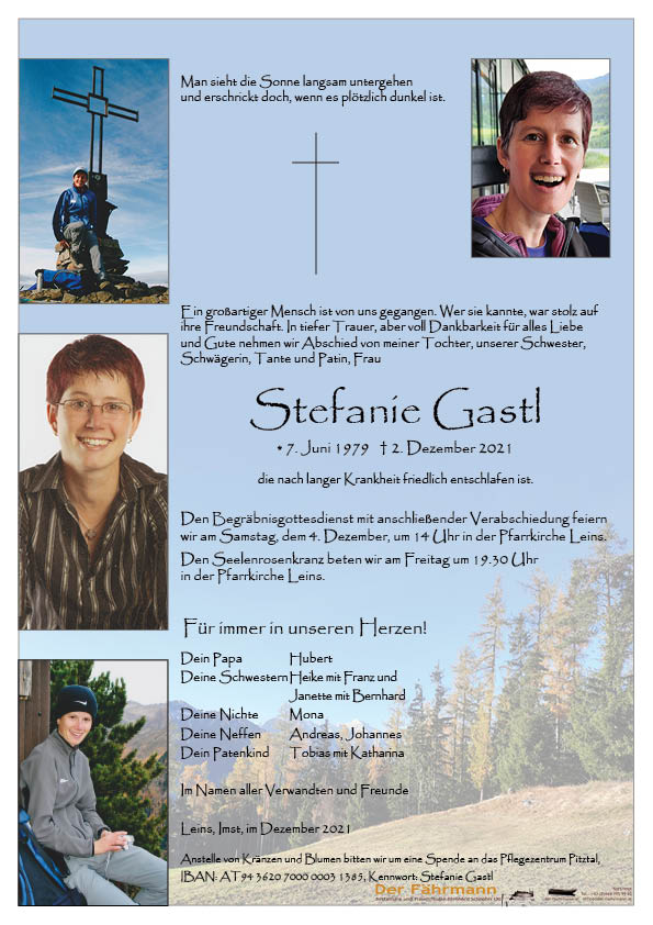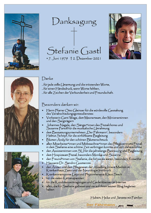 Mit großer Trauer hab ich vom Heimgang Eurer geliebten Stefanie erfahren, wir werden Ihr Lächeln und ihre positive Art immer in Erinnerung behalten. Wir wünschen Euch viel Kraft in dieser schweren Zeit…