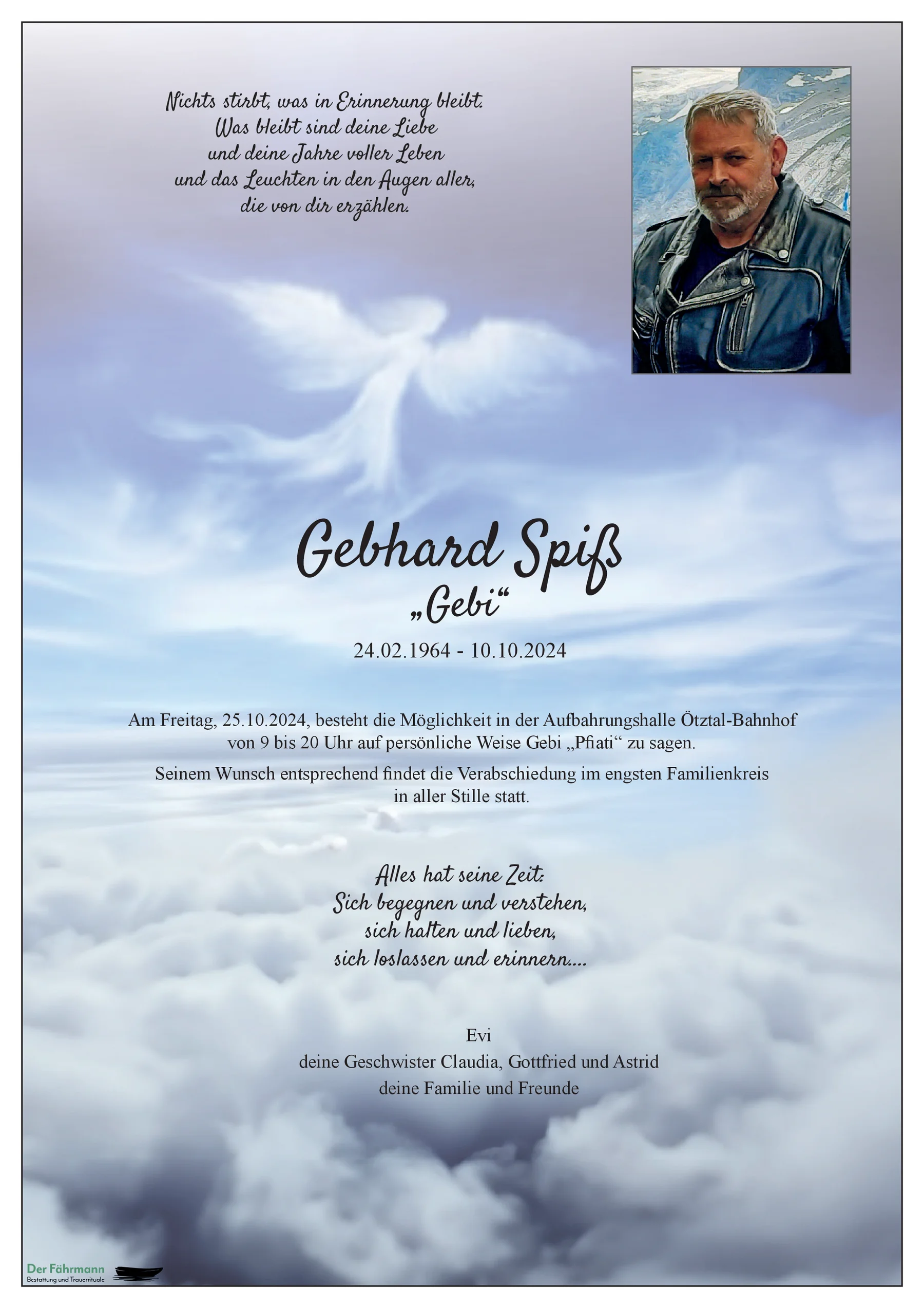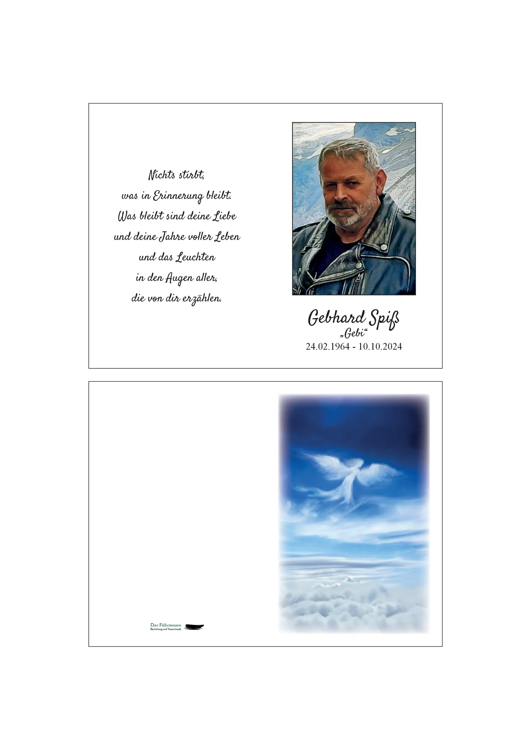 Liebe Trauerfamilie Ich habe Gebi auf der Tankstelle kennengelernt und es war ein toller Mensch. Wünsche euch viel Kraft in dieser schweren Zeit aber ihr werdet ihn wieder sehen .Gebi Ruhe in Frieden. Conny Lechleitner