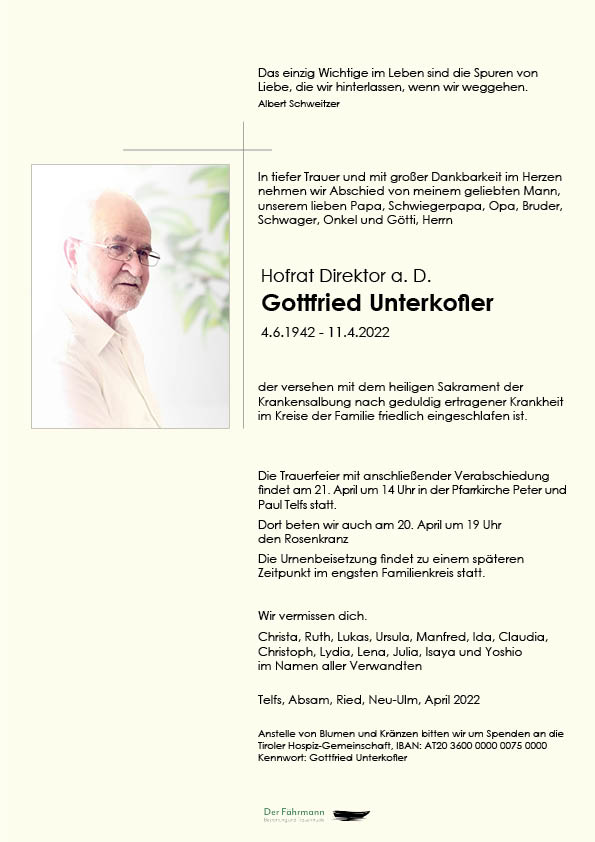 Liebe Familie Unterkofler wir wollen hier auch unsere Anteilnahme zum Ausdruck bringen.