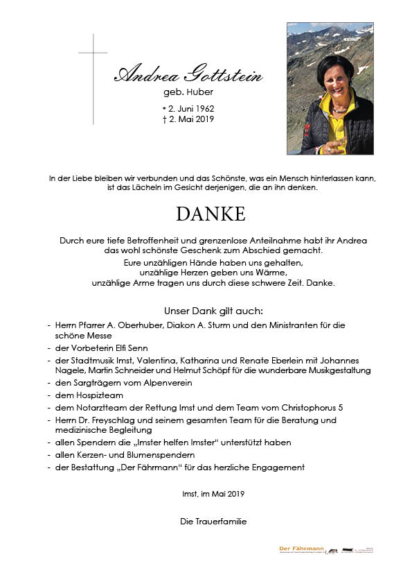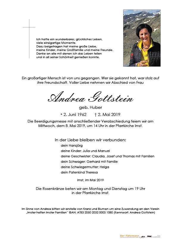 Andrea war ein so unglaublich großherziger, fröhlicher und hilfsbereiter Mensch. Sie hatte so viele positiven Eigenschaften und es war immer sehr schön wenn man ihr begegnet ist. Sie hinterlässt eine große Lücke. In Gedanken sind wir bei euch und wünschen euch viel Kraft in diesen schweren Stunden. Unsere aufrichtige Anteilnahme. Ihr herzliches Lachen bleibt unvergessen.