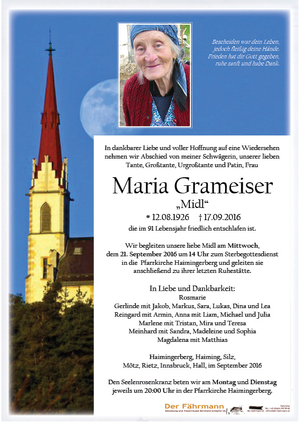 Grameiser Maria 12.08.1926 17.09.2016 Haimingerberg Beisetzungs-Ort: Friedhof Haimingerberg Parte Gedenkkerzen Kondolenzen Parte downloaden Gedenkkerzen für Grameiser Maria 42 Einträge Kerze anzünden Wolfgang Köck A Liachtl aus Silz in lieben Gedanken helene Maria A. Ruhe in Frieden, Maria Familie Schöpf, Haiming Ruhe in Frieden Elfi Fam. Neurauter Lois und Romana Fam. Neurauter Lois und Romana Fam. Neurauter Lois und Romana Ruhe in Frieden Christine mit Familie Fam. Bernd Prantl Gerda Muglach eine gute Überfahrt „Bestattung DER FÄHRMANN“ Anita Zumtobel und Josef Muglach Familie Gritsch Johann Ruhe in Frieden Fam.Pirpamer Pfauslersilvia hans jäger telfs Strigl Rosina & Peter Fam. Peter und Gunnel Zoller Peter u. Melanie Prantl Waltraud&Helmut Fam.Löffler Gerhard und Inge Renate und Isolde Schlatter Stefan mit Familie Harald&Lilli mit Kinder A Liachtl aus Haiming Raffl Monika Helga Hanin Seppi,Tanja,Nadine u.Lukas Ruhe in Frieden Fam.Peter u.Dora Stigger Uschi und Pepi Gaby und Gerhard Silke mit Familie Hedy Haslwanter Jasmin und Florian Herma m.Stefanie u. Denise Johann u. Manuela m.Kinder Gertraud Regina u Volker Eine Kerze für Grameiser Maria Ihr Name* Ihre Nachricht oder Name* E-Mail-Adresse* Mit dem Klicken auf "Kerze anzünden" erklären Sie sich mit unseren Datenschutzbestimmungen einverstanden. Kondolenzbuch für Grameiser Maria 0 Einträge Kondolenz verfassen Ihr Abschiedsgruß an Grameiser Maria Ihr Name* E-Mail-Adresse* Ihre Nachricht* Mit dem Klicken auf "Gruß absenden" erklären Sie sich mit unseren Datenschutzbestimmungen einverstanden. Grameiser Maria 12.08.1926 – 17.09.2016 Parte Gedenkkerzen Kondolenzen Kerze anzünden Kondolenz verfassen