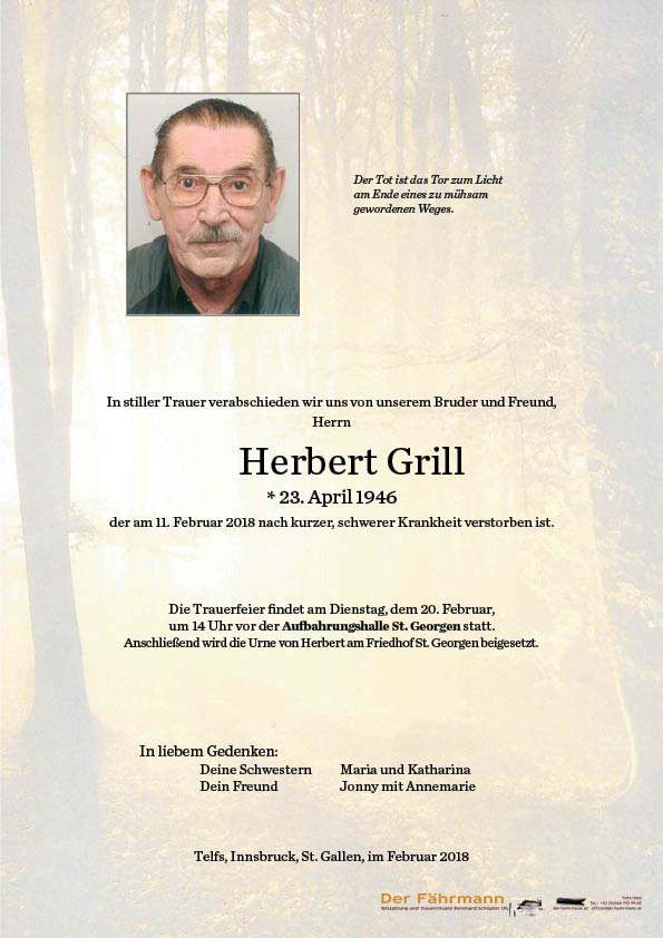 Grill Herbert 23.04.1946 11.02.2018 Telfs Beisetzungs-Ort: St. Georgenfriedhof Telfs Parte Gedenkkerzen Kondolenzen Parte downloaden Gedenkkerzen für Grill Herbert 30 Einträge Kerze anzünden Wolfgang Köck Ruhe in Frieden einen letzten Gruß vom Fernfahrerkollegen Reinhard Ruhe in Frieden! A Liachtl für di von Fam Fasching Isolde u. Helmut R.I.P. Elisabeth Stroj m. Fam Ruhe in Frieden Fam. Peter Klieber Fam Hieber Ties Ruhe in Frieden Monika und Siggi A Liachtl für di! Ruhe sanft! Moni ruhe in frieden schulkollege, Huber Ernst+ Ulli Ruhe in Frieden, Sybille und Vitus Hagele Herbert R.I.P. Hubert Neururer / Telfs Gabi und Erwin Helene und Felix Im Herzen wirst Du immer bei uns sein! Maria + Katharina Grill Annemarie mit Familie Fam. Grill Klaus Wolfgang Köck Gute Reise Margit Winkler-Hagele Doris und Hans Peter Schiller Ruhe in Frieden Maria Stefanie in lieber Erinnerung , Helmut und Rosmarie Riener Möge der Himmel die schönste deiner Wohnungen sein eine gute Überfahrt Bestattung DER FÄHRMANN Eine Kerze für Grill Herbert Ihr Name* Ihre Nachricht oder Name* E-Mail-Adresse* Mit dem Klicken auf "Kerze anzünden" erklären Sie sich mit unseren Datenschutzbestimmungen einverstanden. Kondolenzbuch für Grill Herbert 0 Einträge Kondolenz verfassen Ihr Abschiedsgruß an Grill Herbert Ihr Name* E-Mail-Adresse* Ihre Nachricht* Mit dem Klicken auf "Gruß absenden" erklären Sie sich mit unseren Datenschutzbestimmungen einverstanden. Grill Herbert 23.04.1946 – 11.02.2018 Parte Gedenkkerzen Kondolenzen Kerze anzünden Kondolenz verfassen