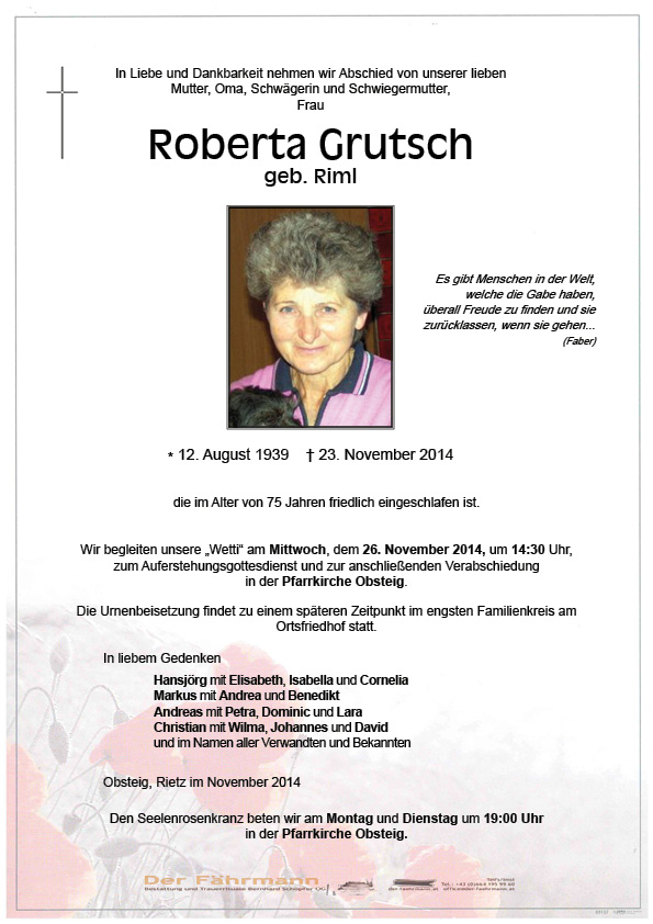 Kondolenzbuch für Grutsch Roberta