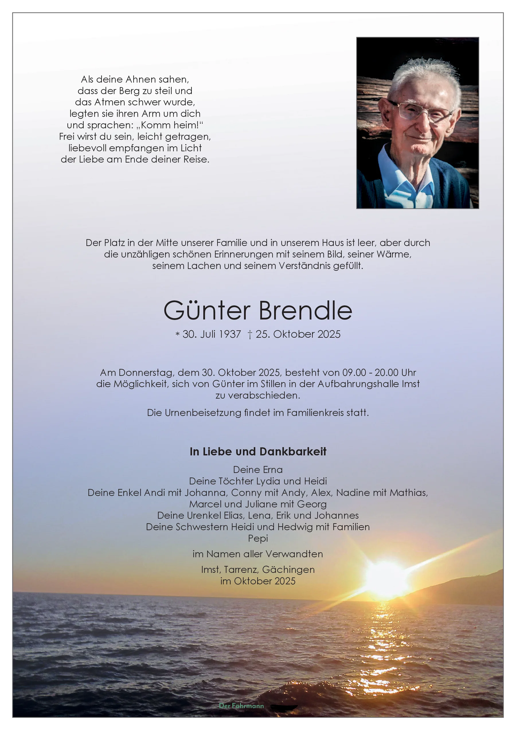 Für das irdische Abschiednehmen von euerm geliebten Günter wünsch ich euch viel Kraft, gemeinsames Tragen des grossen Verlustes und das Wissen, dass Günter mit seiner Herzenskraft immer bei euch ist.