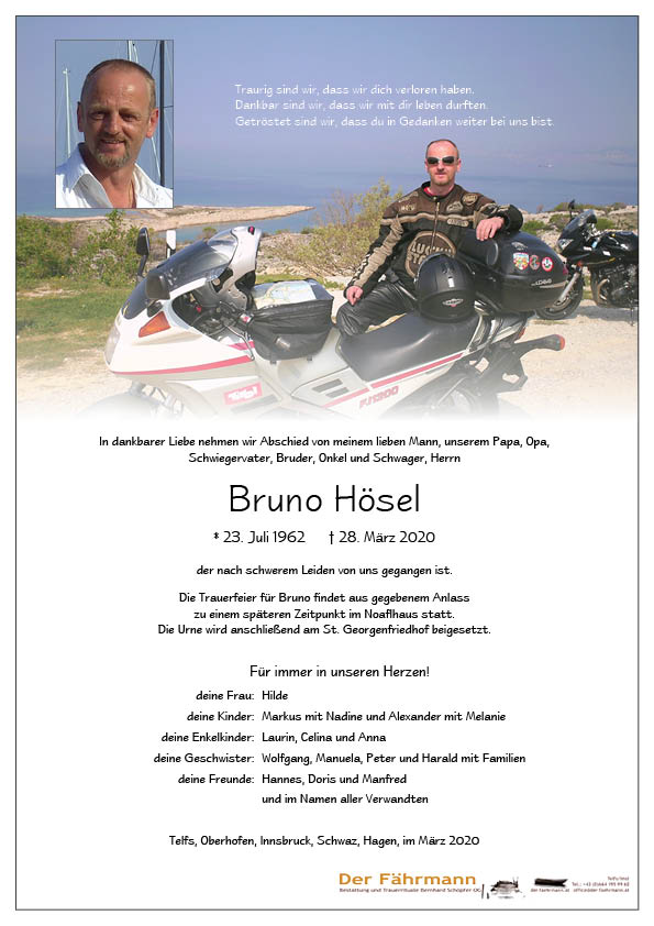 Rainer Eva Hospizbewegung Telfs. Wenn sich der Vater Augen schließen,der Tod das treue Herz ihm bricht, dann ist das schönste Band zerissen, ein Vaterherz ersetzt man nicht!! GUTE REISE LIEBER BRUNO
