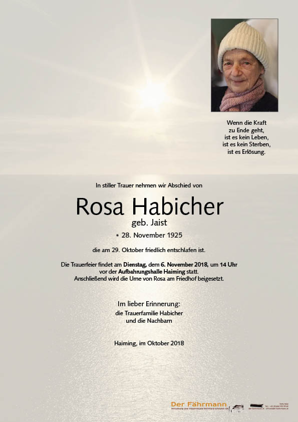 Habicher Rosa 28.11.1925 29.10.2018 Haiming Beisetzungs-Ort: Friedhof Haiming Parte Gedenkkerzen Kondolenzen Parte downloaden Gedenkkerzen für Habicher Rosa 14 Einträge Kerze anzünden Jucy Fam. Lechleitner F Alfred Neurauter Wolfgang Köck Bernd u. Carmen Kapeller Rosina u. Peter Strigl In stillem Gedenken deine Nachbarn Haslwanter/Schöpf Ruhe in Frieden Schöpf Cornelia a Kerzle für die Reise Norbert Manuel Praxmarer, Imst Eine schöne Reise wünschen wir dir Rosa. Manuel u. Nadine eine gute Überfahrt Bestattung DER FÄHRMANN Eine Kerze für Habicher Rosa Ihr Name* Ihre Nachricht oder Name* E-Mail-Adresse* Mit dem Klicken auf "Kerze anzünden" erklären Sie sich mit unseren Datenschutzbestimmungen einverstanden. Kondolenzbuch für Habicher Rosa 0 Einträge Kondolenz verfassen Ihr Abschiedsgruß an Habicher Rosa Ihr Name* E-Mail-Adresse* Ihre Nachricht* Mit dem Klicken auf "Gruß absenden" erklären Sie sich mit unseren Datenschutzbestimmungen einverstanden. Habicher Rosa 28.11.1925 – 29.10.2018 Parte Gedenkkerzen Kondolenzen Kerze anzünden Kondolenz verfassen