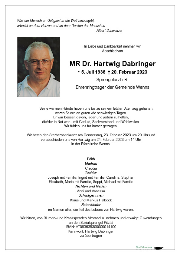 Wir möchten euch allen unser aufrichtiges Beileid aussprechen und viel Kraft für die schwere Zeit wünschen. Wir werden Dr. Hartwig Dabringer stets in liebevoller Erinnerung behalten. Er hat viel für Wenns geleistet und ist unzähligen Gemeindebürgern hilfreich zur Seite gestanden. Vergelt's Gott.