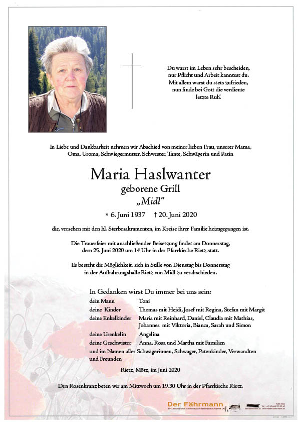 Kondolenzbuch für Haslwanter Maria