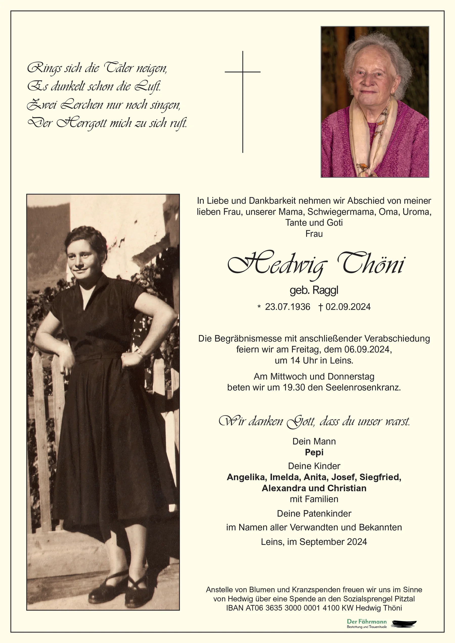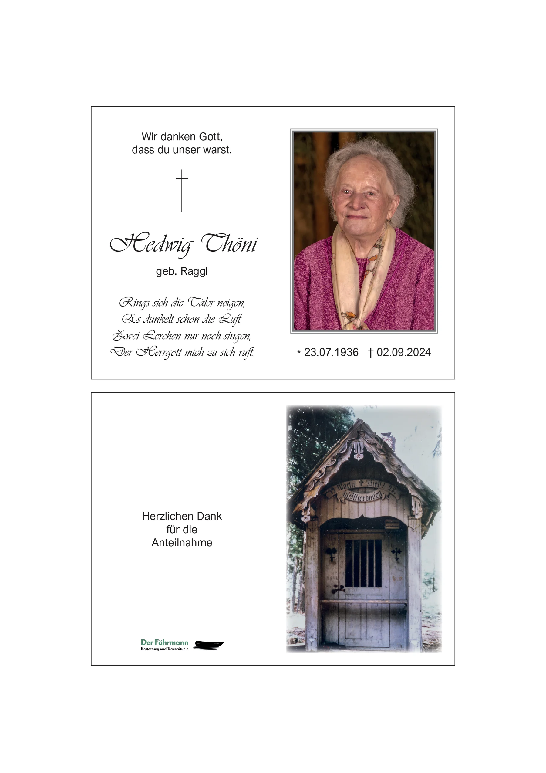 Der Lebenskreis von Hedwig hat sich nach einem erfüllten Leben nun geschlossen. Was bleibt, sind schöne Erinnerungen, gemeinsame Momente und Augenblicke, die unvergessen in euren Herzen bleiben werden.