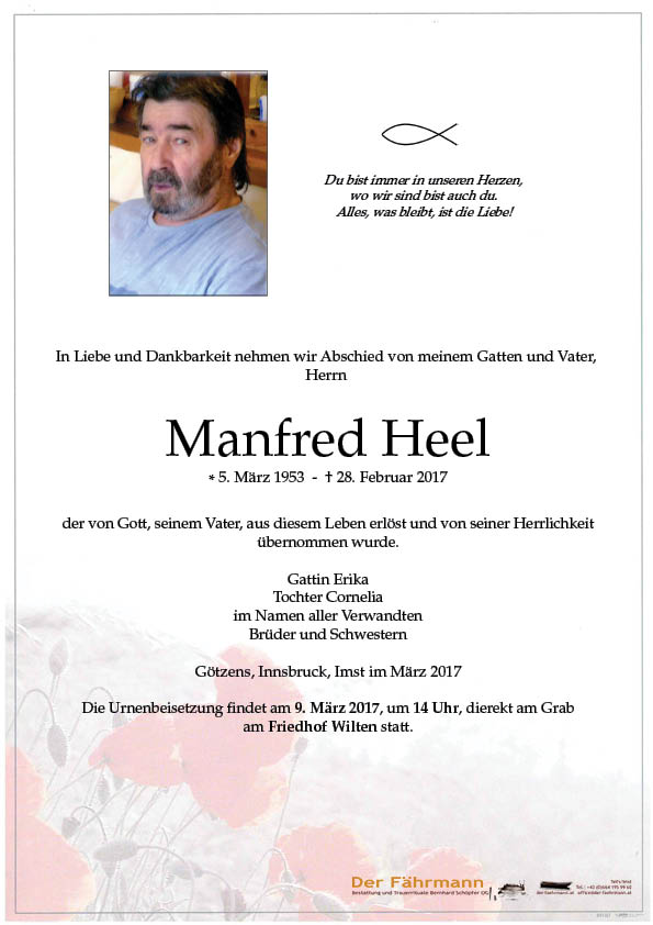 Heel Manfred 05.03.1953 28.02.2017 Innsbruck Beisetzungs-Ort: Friedhof Wilten Parte Gedenkkerzen Kondolenzen Parte downloaden Gedenkkerzen für Heel Manfred 202 Einträge Kerze anzünden Gerda und Hansjörg ?️ A Weihnachtskerzl für di ?️ A Allerheiligenkerzl für di ?️ A Osterkerzl für di ?️ A Weihnachtskerzl für di ⭐ A Neujahrskerzl für di ✨ A Weihnachtskerzl für di ⭐ A Adventkerzl für di ? Gerda und Hansjörg ✨ A Allerheiligenliachtl für di ? Gerda und Hansjörg ? Gerda und Hansjörg ✨ Gerda und Hansjörg ✨ Gerda und Hansjörg ✨ Gerda und Hansjörg Gerda und Hansjörg A Osterkerzl für di A Osterkerzl für di Gerda und Hansjörg Gerda und Hansjörg Gerda und Hansjörg Gerda und Hansjörg A Jahrtagskerzl für di A Jahrtagskerzl für di Gerda und Hansjörg Gerda und Hansjörg Wolfgang Köck Ruhe in Frieden A Liachtl für die Reise A Liachtl für die Reise A Weihnachtsliachtl für di A Weihnachtsliachtl für di A Weihnachtsliachtl für di A Weihnachtsliachtl für di Gerda und Hansjörg Gerda und Hansjörg Gerda und Hansjörg Gerda und Hansjörg Gerda und Hansjörg Gerda und Hansjörg Gerda und Hansjörg Gerda und Hansjörg Gerda und Hansjörg Gerda und Hansjörg Gerda und Hansjörg Gerda und Hansjörg Frohe Weihnacht Frohe Weihnacht Gerda und Hansjörg Gerda und Hansjörg Gerda und Hansjörg Wir sehen uns. Deine Cornelia Danke Cornelia Danke Cornelia Gerda und Hansjörg Gerda und Hansjörg Gerda und Hansjörg Gerda und Hansjörg Gerda und Hansjörg in liebevoller Erinnerung in lieber Erinnerung Franz und Christl in lieber Erinnerung Armin Gerda und Hansjörg Gerda und Hansjörg Danke Papa. Ich vermisse dich in lieber Erinnerung Franz und Christl Irgendwann sehn wir uns wieder Ruhe in Frieden Onkel Manni Schwester Barbara Andrea und Gregor mit Martina in lieber Erinnerung Franz und Christl Schwester Barbara Stefan Conny auf ein Wiedersehen In lieber Erinnerung Barbara in lieber Erinnerung Franz und Christl Franz und Christl Deine Tochter Für meinen lieben Papa In tiefer Verbundenheit deine Tochter Conny Für meinen lieben Papa das Ewige Licht leuchte Dir Irgendwann sehn wir uns wieder das Ewige Licht leuchte Dir In lieber Erinnerung Barbara Andrea und Gregor mit Martina Franz und Christl Gerda und Hansjörg Cornelia u Christine Gerda und Hansjörg Gerda und Hansjörg Ruhe in Frieden Onkel Manni Cornelia Gerda und Hansjörg Gerda und Hansjörg Irgendwann sehn wir uns wieder Franz und Christl In tiefer Verbundenheit deine Tochter Conny In tiefer Verbundenheit deine Tochter Conny Gerda und Hansjörg Gerda und Hansjörg für immer in unseren Herzen du fehlst uns sehr Andrea und Gregor mit Martina Franz Heel ruhe in Gottes Geborgenheit Andrea und Gregor mit Martina du fehlst uns sehr in lieber Erinnerung Armin in lieber Erinnerung Franz und Christl Irgendwann sehn wir uns wieder Cornelia und Erika Cornelia und Erika Frohe Ostern Gerda und Hansjörg Gerda und Hansjörg Franz und Christl In lieber Erinnerung Barbara Gerda und Hansjörg Ich vermisse dich Cornelia für immer in unseren Herzen in lieber Erinnerung Franz und Christl In lieber Erinnerung Barbara Irgendwann sehn wir uns wieder Gerda und Hansjörg Gerda und Hansjörg Gerda und Hansjörg Gerda und Hansjörg in lieber Erinnerung Franz und Christl Ruhe in Frieden In lieber Erinnerung Barbara Ruhe in Frieden in lieber Erinnerung Armin Andrea und Gregor mit Martina auf ein Wiedersehen in liebevoller Erinnerung Gerda und Hansjörg Gerda und Hansjörg Simone u. Bernd Wege Ruhe in Frieden Onkel Manni in Gedanken bei dir Barbara in lieber Erinnerung Andrea und Gregor Franz und Christl Herta u. Helmut Bonvicin Gute Reise! Tamara Gerda und Hansjörg dieter oberkofler für immer in unseren Herzen in lieber Erinnerung Christl Du bist ewig in meinem Herzen verankert Conny Bernike in Gedanken bei dir Barbara Florian mit Familie das Ewige Licht leuchte Dir in lieber Erinnerung Anni mit FAMILIE Ruhe in Frieden Thomas Ruhe in Frieden Das ewige Licht leuchte dir. Elke und Günter Alles Gute für deine weitere Reise..Alles Liebe Petra Alles Gute für deine weitere Reise..Alles Liebe Petra mochs guat da oben Manni Ruhe in Frieden Hildegard mit Familie in lieber Erinnerung Franz a,Geburstagslichtle Danke Papa für alles!!! Deine geliebte Tochter Cornelia Gerda und Hansjörg Heel Christoph Heel Theresia und Hans Ruhe in Frieden Fam.Berni & Rosa Larcher Wenns Fam. Luis Schlierenzauer ein Licht für deine Reise Viel Kraft für die Trauerfamilie Kumpel Bruno Gute Reise Ruhe in Frieden Onkel Manni Desiree und Daniel mit Emilio Philip mit Familie Patin Flora mit Familie aus der Schweiz Irgendwann sehn wir uns wieder in lieber Erinnerung Armin Fam.Hubert und Claudia Götsch Fam. Paul und Ilse Karbon Schwester Barbara Neffe Markus mit Familie Schwester Barbara Viel Kraft für die Trauerfamilie Ruhe in Frieden Onkel Manni auf ein Wiedersehen Andrea und Gregor mit Martina Gute Reise ins Licht Franz und Christl Harpf Christl das Ewige Licht leuchte dir Schöpf Barbara mit Familie Barbara Stillebacher in lieber Erinnerung Mike Ruhe in Frieden hans jäger telfs eine gute Überfahrt – Bestattung DER FÄHRMANN Eine Kerze für Heel Manfred Ihr Name* Ihre Nachricht oder Name* E-Mail-Adresse* Mit dem Klicken auf "Kerze anzünden" erklären Sie sich mit unseren Datenschutzbestimmungen einverstanden. Kondolenzbuch für Heel Manfred 1 Eintrag Kondolenz verfassen Ich gehe Euch voraus in den ewigen Frieden des Herrn, und erwarte Euch zum ewigen Wiedersehen. GOTTES WILLE ist geschehen. in lieber Erinnerung 02.03.2017 | 14:18 Uhr Ihr Abschiedsgruß an Heel Manfred Ihr Name* E-Mail-Adresse* Ihre Nachricht* Mit dem Klicken auf "Gruß absenden" erklären Sie sich mit unseren Datenschutzbestimmungen einverstanden. Heel Manfred 05.03.1953 – 28.02.2017 Parte Gedenkkerzen Kondolenzen Kerze anzünden Kondolenz verfassen