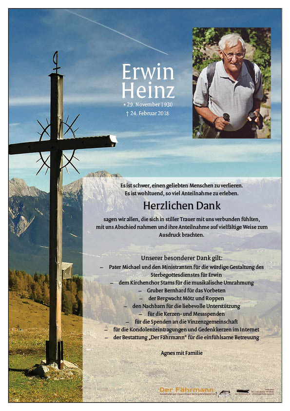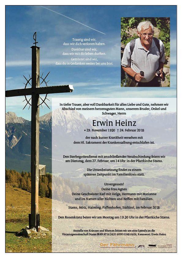Zum Tode Deines lieben Erwins möchte ich Dir von ganzem Herzen mein Beileid aussprechen. Ich erinnere mich gerne an die schönen Stunden ,die Du mit Erwin,Herta und Melchior bei mir in Schlinig verbracht hast. Deine Christl vom Gasthof Edelweiss in Schlinig Südtirol