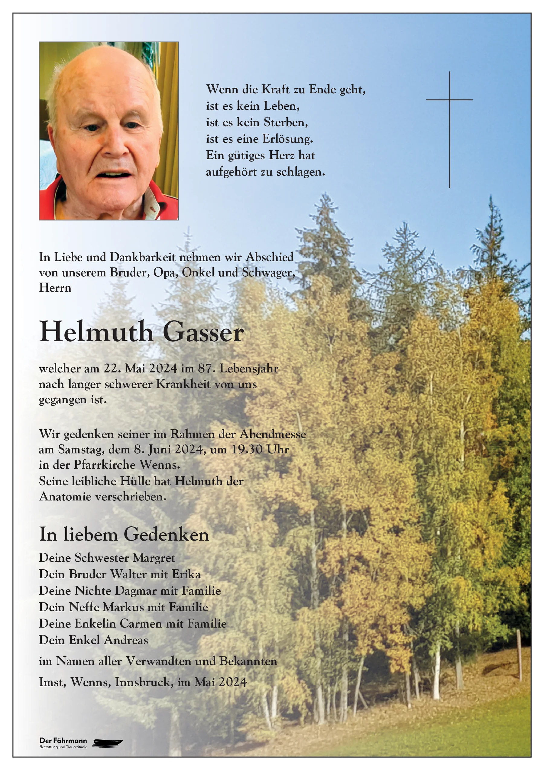 Helmuth Gasser 13.05.1937 22.05.2024 Wenns Messe, Pfarrkirche Wenns 08.06.2024, 19:30 Uhr Route Parte Sterbebild Gedenkkerzen Kondolenzen Parte downloaden Sterbebild downloaden Gedenkkerzen für Helmuth Gasser 76 Einträge Kerze anzünden Das ewige Licht leuchte dir ? Ilse Ruhe in Frieden Ein Kerzlein für Dich Fam. Sieglinde und Josef Holzknecht Paul und Monika Schöpf Arzl Helma mit Bernhard und Christian Helma Prantl Ruhe in Frieden Elias und Aaron In Stillen Gedenken Markus und Anita Fischer Simone & René mit Yvonne, Nico Gundolf Maria, Richard Conny Ehrhart mit Familie Elfriede Schöpf mit Familie Ruhe in Frieden! Roswitha Santer Wien RIP! Marlies & Hermann Reinstadler mit Familie Ruhe in Frieden! Berni Larcher mit Familie Renate Larcher Harpf Christine Harpf Christine Erwin und Evi Hafele Ein Kerzlein für Dich Fam.Pechtl Hanni Wir sind nur Gast auf Erden Ruhe in Frieden Werner und Manuela Fam. Stefan und Sieglinde Donner aufrichtige Anteilnahme! Fam.Eiter Gerda Ramona Hofer Familie Hans und Lisbeth Wille Ruhe in Frieden! Manfred Mathoi Fam.Bernhard Eiter Bichl Ruhe in Frieden Alois Partl Eggmahd Fam. Melmer Angelika Heinz & Elisabeth lanbach Ruhe in Frieden Hubert und Klara Hirlanda Praxmarer Fam.Gundolf Maria Eggmahd Ruhe in Frieden!Weber Hubert mit Familie Weber Petra und Mathias mit Familie Harpf Christl Ehem.Nachbarin Reingard m.Fam. Franz und Birgit Gabl Ursula, Magnus und Emil Ludwig und Ingrid Ruhe in Frieden Ilse & Charly Beate und Carly Duller Petra Werner Tiefenbrunner Annabell&Tommy Fringer Andreas u. Renate Deutschmann Fam. Sibylle und Wolfgang Auer Hob's fein im Himmel ?⭐️....Ilse Karbon Fam.Mario und Priska Gundolf Klaudia und Ewald Sturm Deine Enkelin Carmen??? Fam.Karl und Irmgard Kathrein Fam. Cordula Raggl Ruhe in Frieden! Fam. Walter Hammerle Fam. Raimund&Claudia Pfefferle Ruhe in Frieden! Hans und Marlene A.u.E.Helbock R.I.P. Familie Karin und Manfred Stoll Erwin und Anni Winkler Aufrichtige Anteilnahme entbietet Schweigl Anja Aufrichtige Anteilnahme entbietet Schweigl Anja Marina mit Familie Gundolf Günter Ruhe in Frieden-Erika Karbon Wassermann Maria Ruhe in Frieden Fam.Olga und Hansi Leitner Ruhe in Frieden Familie Elisabeth und Franz Eiter Lukas mit Mona Dein Bruder Walter mit Erika Dagmar und Florian Ruhe in Frieden Dagmar und Florian Ruhe in Frieden deine Schwester Margret Ruhe in Frieden Eine Kerze für Helmuth Gasser Ihr Name* Ihre Nachricht oder Name* E-Mail-Adresse* Mit dem Klicken auf "Kerze anzünden" erklären Sie sich mit unseren Datenschutzbestimmungen einverstanden. Kondolenzbuch für Helmuth Gasser 0 Einträge Kondolenz verfassen Ihr Abschiedsgruß an Helmuth Gasser Ihr Name* E-Mail-Adresse* Ihre Nachricht* Mit dem Klicken auf "Gruß absenden" erklären Sie sich mit unseren Datenschutzbestimmungen einverstanden. Helmuth Gasser 13.05.1937 – 22.05.2024 Parte Sterbebild Gedenkkerzen Kondolenzen Kerze anzünden Kondolenz verfassen