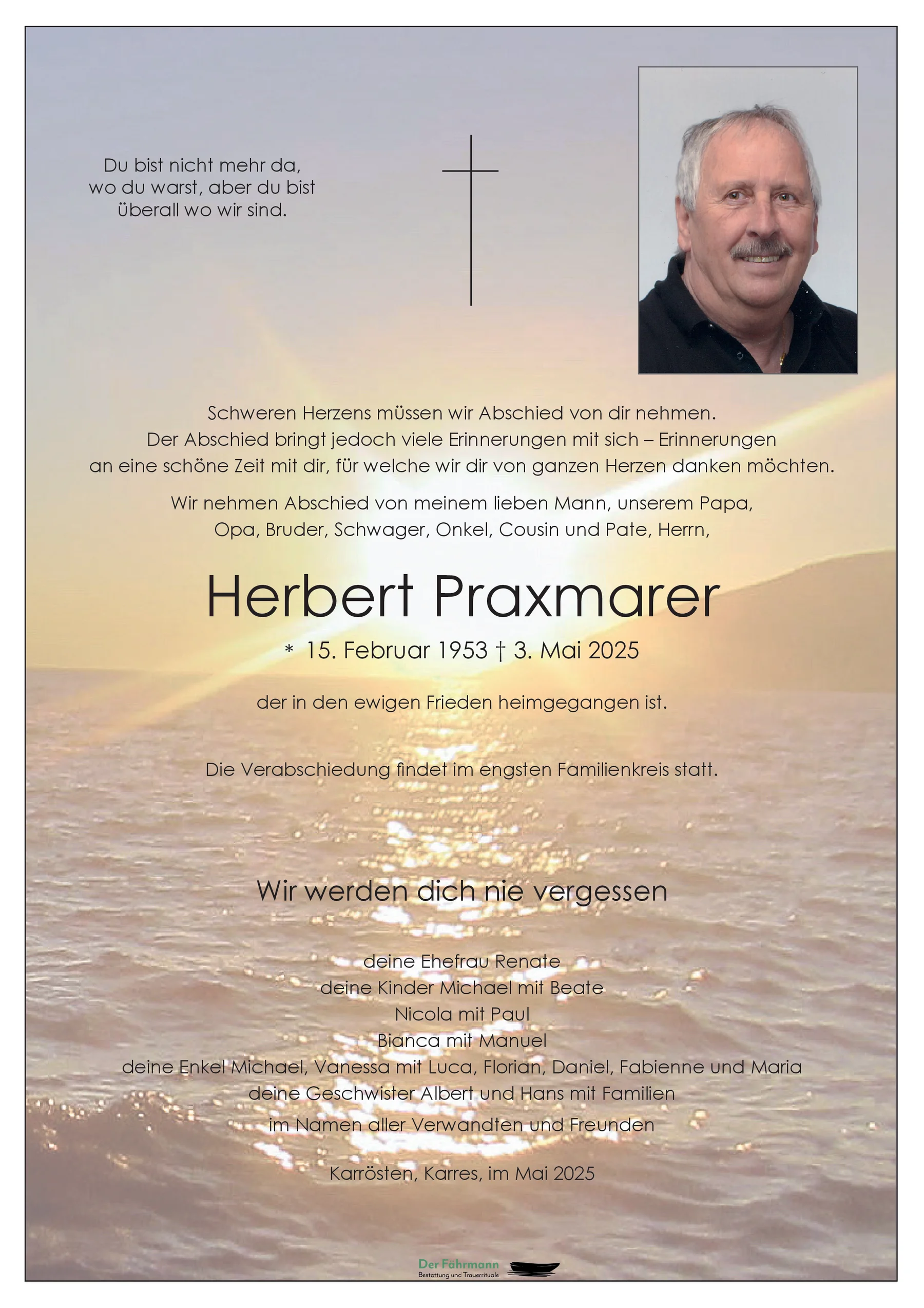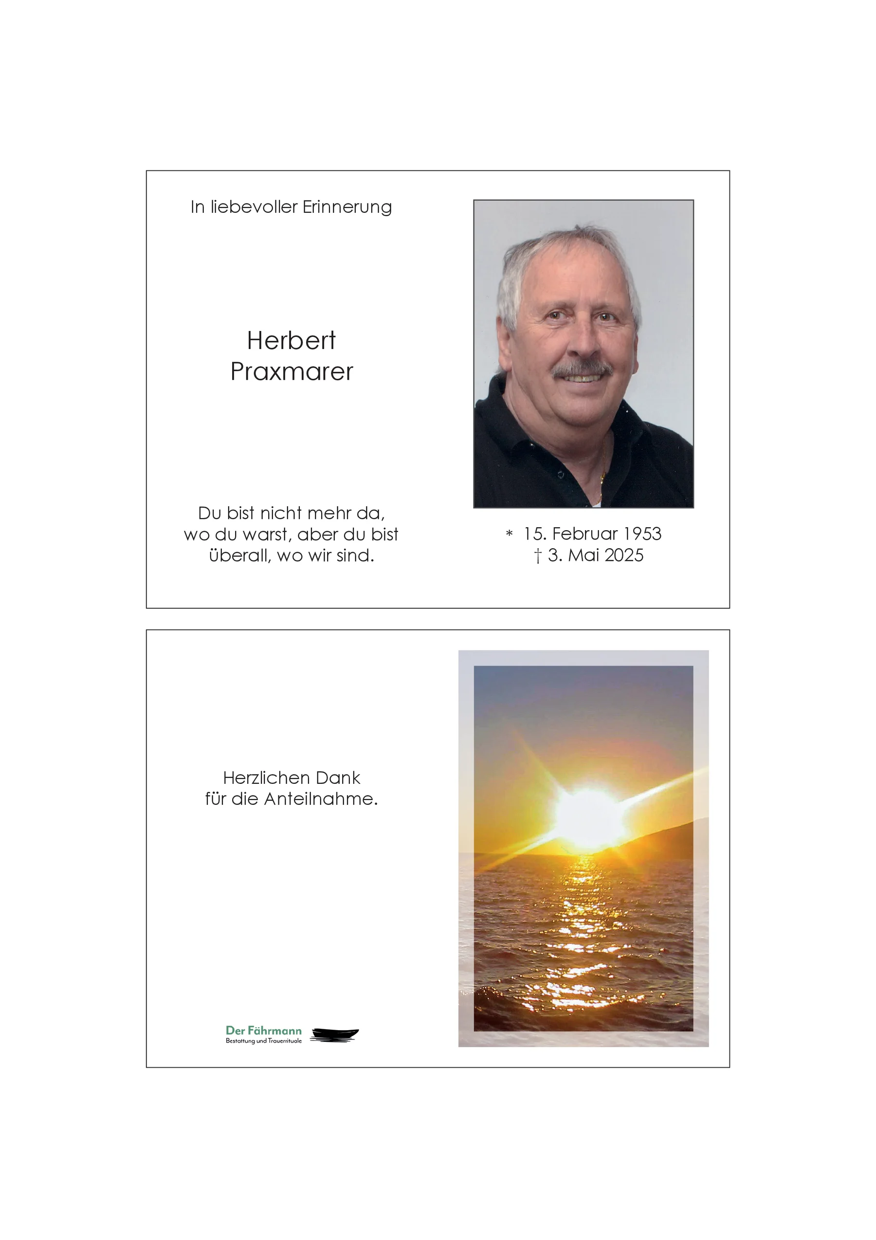Ihr mögt in dieser schweren Zeit Trost und Kraft in der Gemeinschaft eurer Familie und Freunden finden. Die Erinnerungen an die schönen Momente mit Herbert sollen euch in den kommenden Tagen Halt geben.
