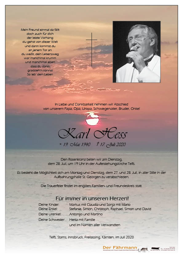Habe bei meinen letzten Gesprächen mit Onkel Karl vor allem über diesem Thema betreffend der Ewigkeit gute Gespräche gehabt. Ich wünsche ihm von ganzen Herzen ein klares Ja, auf die Frage von Jesus, dem Sohn des ewigen Schöpfergottes gehabt zu haben.