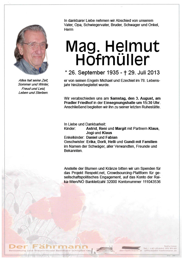 Hofmüller Helmuth 26.09.1935 29.07.2013 Innsbruck Beisetzungs-Ort: Innsbruck Parte Gedenkkerzen Kondolenzen Parte downloaden Gedenkkerzen für Hofmüller Helmuth 0 Einträge Kerze anzünden Eine Kerze für Hofmüller Helmuth Ihr Name* Ihre Nachricht oder Name* E-Mail-Adresse* Mit dem Klicken auf "Kerze anzünden" erklären Sie sich mit unseren Datenschutzbestimmungen einverstanden. Kondolenzbuch für Hofmüller Helmuth 0 Einträge Kondolenz verfassen Ihr Abschiedsgruß an Hofmüller Helmuth Ihr Name* E-Mail-Adresse* Ihre Nachricht* Mit dem Klicken auf "Gruß absenden" erklären Sie sich mit unseren Datenschutzbestimmungen einverstanden. Hofmüller Helmuth 26.09.1935 – 29.07.2013 Parte Gedenkkerzen Kondolenzen Kerze anzünden Kondolenz verfassen
