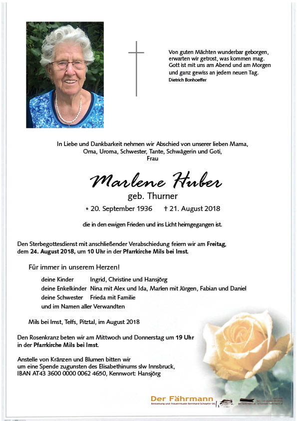 Tief betroffen habe ich die Nachricht vom Ableben eurer lieben Marlene aus der Zeitung erfahren. Wir haben zusammen schöne Zeiten im Krankenhaus Zams erlebt und ich denke immer noch gern daran zurück. Deine nette Art wird mir immer in Erinnerung bleiben. Wir möchten euch allen unser aufrichtiges Beileid aussprechen und viel Kraft für die schwere Zeit wünschen.
