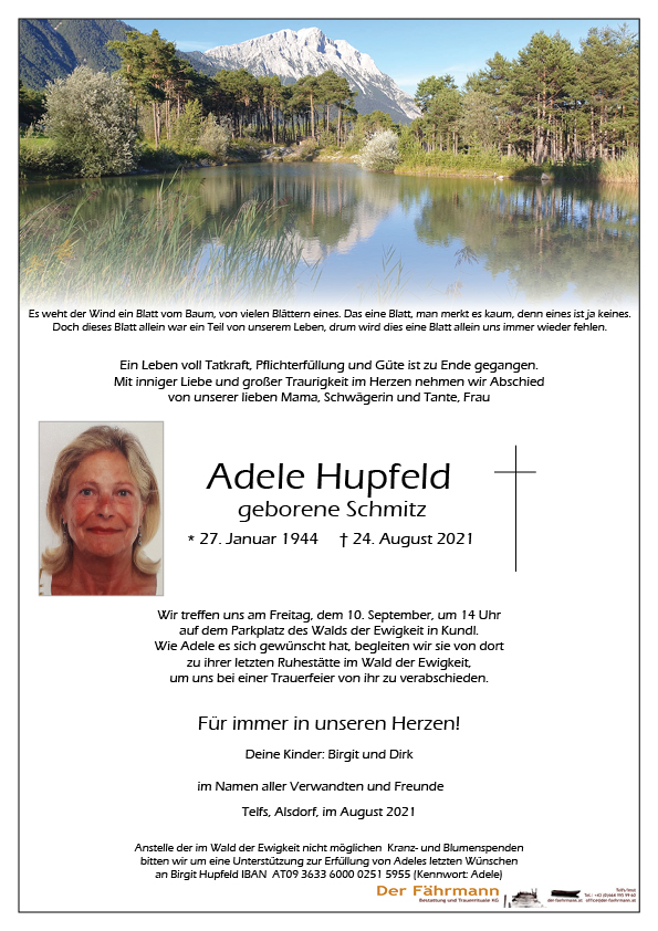 Liebe Birgit ! Mein herzliches Beileid zum Tod von Deiner lieben Mama ! Adele war eine so liebe Kollegin von mir , wir haben viele Stunden in den Pausen miteinander verbracht , haben getratscht und viel gelacht ! Sie war immer sehr stolz auf Dich , liebe Birgit , und das mit Recht ! Liebe Birgit , ich wünsche Dir viel Kraft in dieser schweren Zeit ! Alles Gute in lieber Erinnerung an Adele
