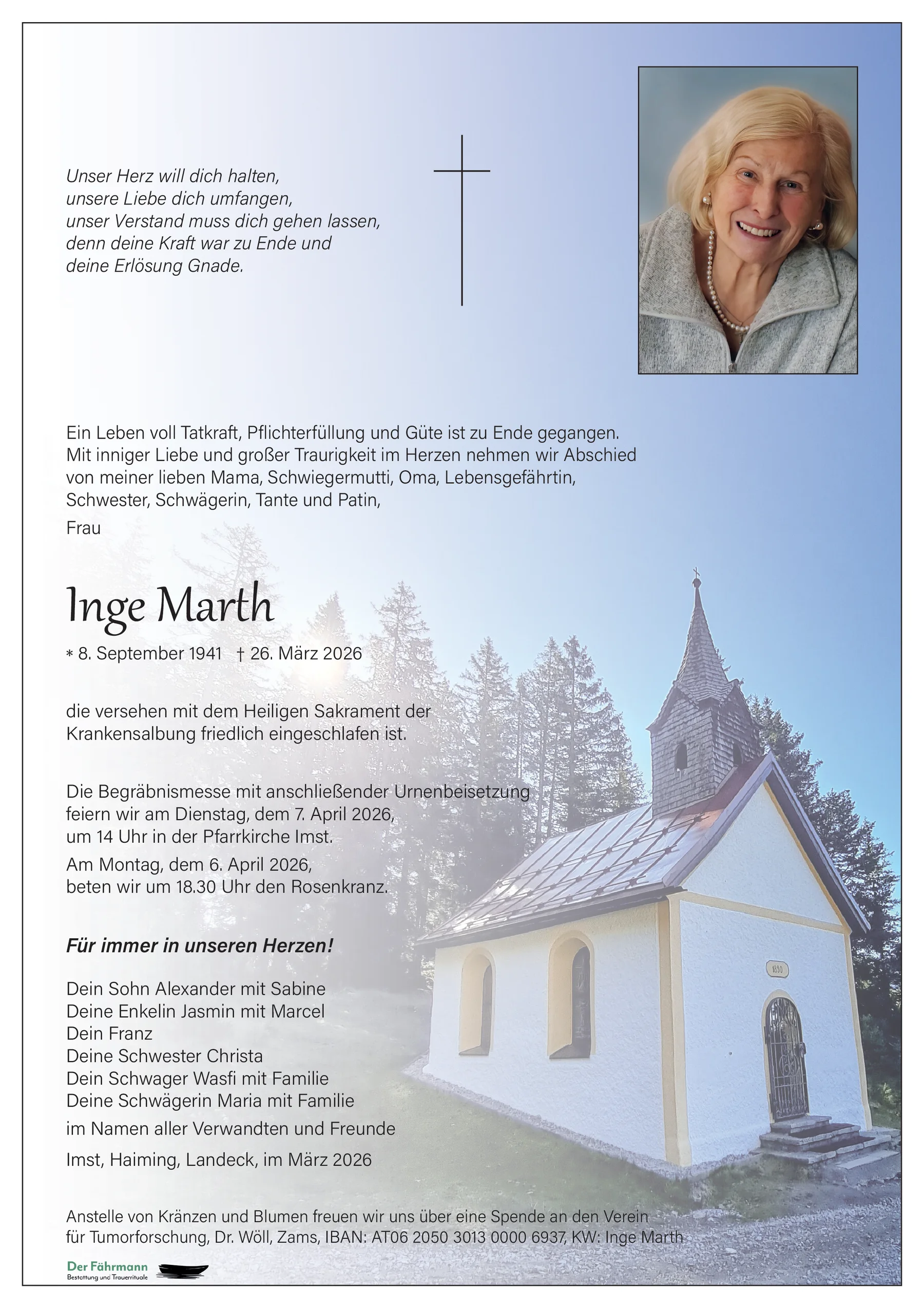 es erfüllt mich mit Trauer, dass eure liebe Inge verstorben ist. Über viele Jahre habe ich sie von der Arbeit in der Druckerei Egger gekannt und sie auch privat sehr geschätzt. Sie war eine hilfsbereite und gute Seele.