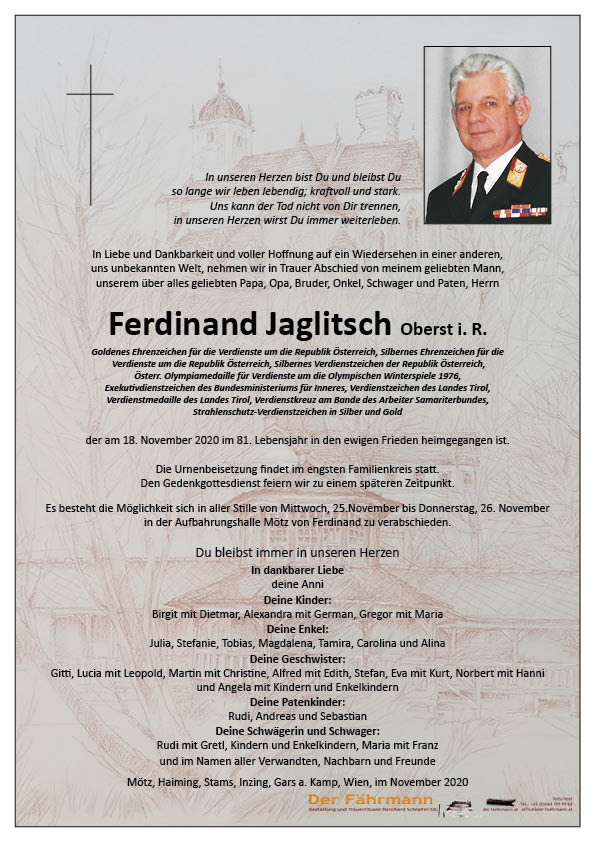 die Jahrgangskollegen des Gehobenen Fachkurseses 1967/69 haben wieder einen aus ihrer Mitte verloren. Ferdinand Jaglitsch war für mich wegen seiner Ruhe, Besonnenheit und Offenheit ein besonderer Mensch. Möge er mich im anderen Leben mit den gleichen Eigenschaften empfangen.