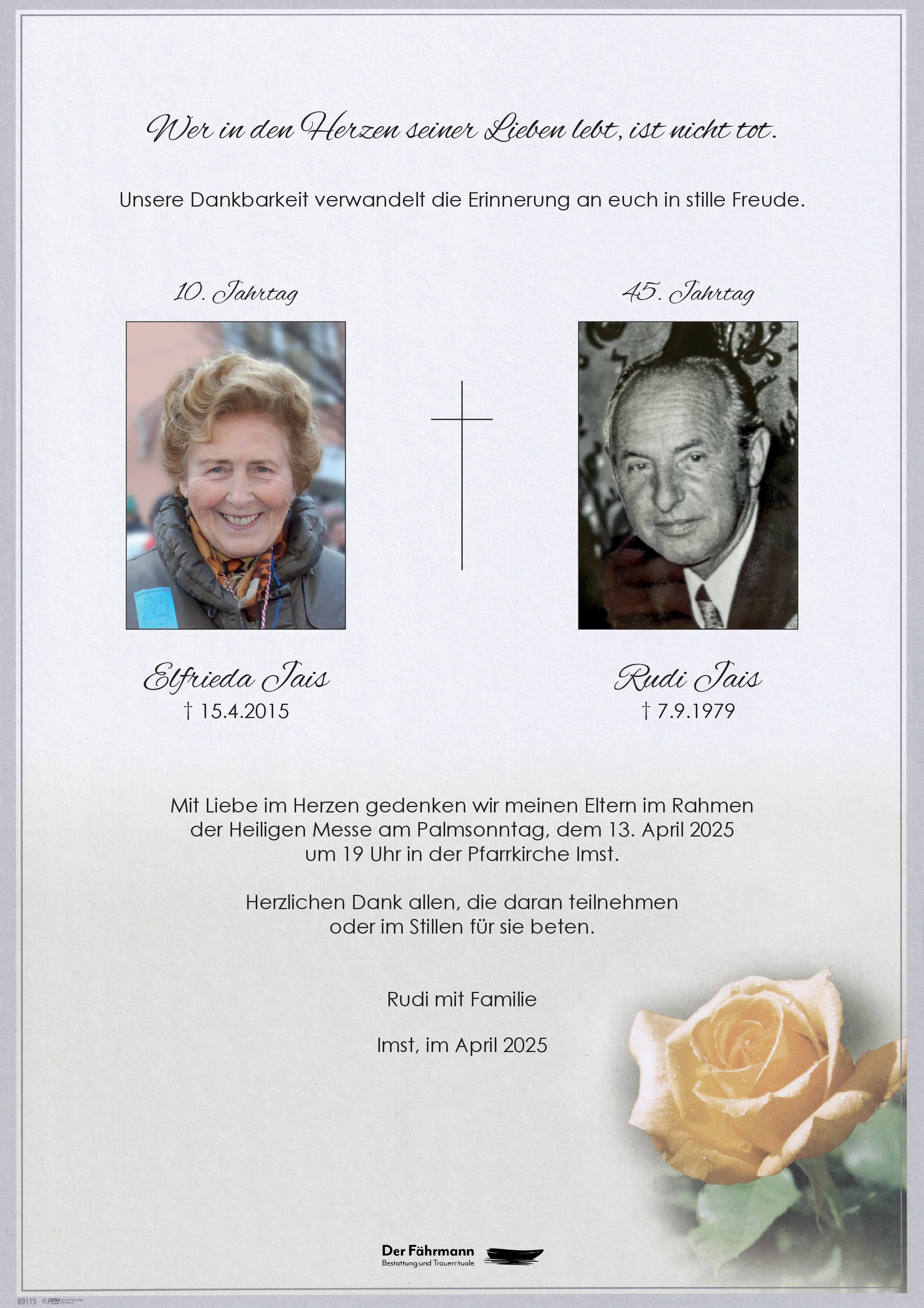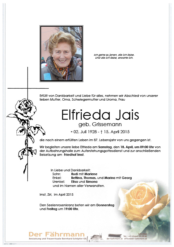 Heute habe ich in der Zeitung die Todesanzeige gelesen und traurig wahrgenommen, dass mir in Zukunft eine mir vertraute und liebevolle Begegnung am Friedhof fehlen wird. Die freundliche und wohlwollende Art von Frau Jais werde ich stets in lieber Erinnerung bewahren.
