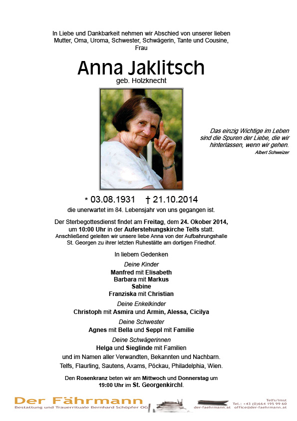 Jaklitsch Anna 03.08.1931 21.10.2014 Telfs Beisetzungs-Ort: Georgenfriedhof Parte Gedenkkerzen Kondolenzen Parte downloaden Gedenkkerzen für Jaklitsch Anna 1 Eintrag Kerze anzünden Fam. Falbesoner und schletterer Eine Kerze für Jaklitsch Anna Ihr Name* Ihre Nachricht oder Name* E-Mail-Adresse* Mit dem Klicken auf "Kerze anzünden" erklären Sie sich mit unseren Datenschutzbestimmungen einverstanden. Kondolenzbuch für Jaklitsch Anna 0 Einträge Kondolenz verfassen Ihr Abschiedsgruß an Jaklitsch Anna Ihr Name* E-Mail-Adresse* Ihre Nachricht* Mit dem Klicken auf "Gruß absenden" erklären Sie sich mit unseren Datenschutzbestimmungen einverstanden. Jaklitsch Anna 03.08.1931 – 21.10.2014 Parte Gedenkkerzen Kondolenzen Kerze anzünden Kondolenz verfassen
