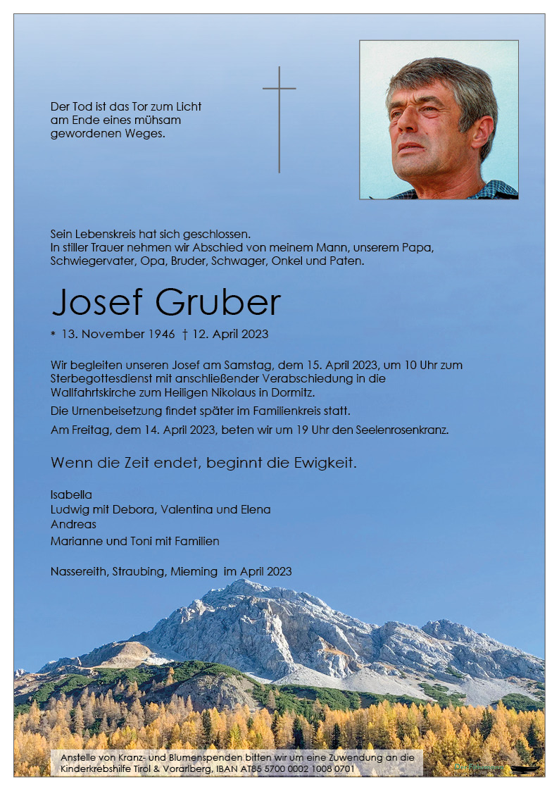 Ruhe in Frieden, Josef. Christine, Thomas, Maria, Lisa