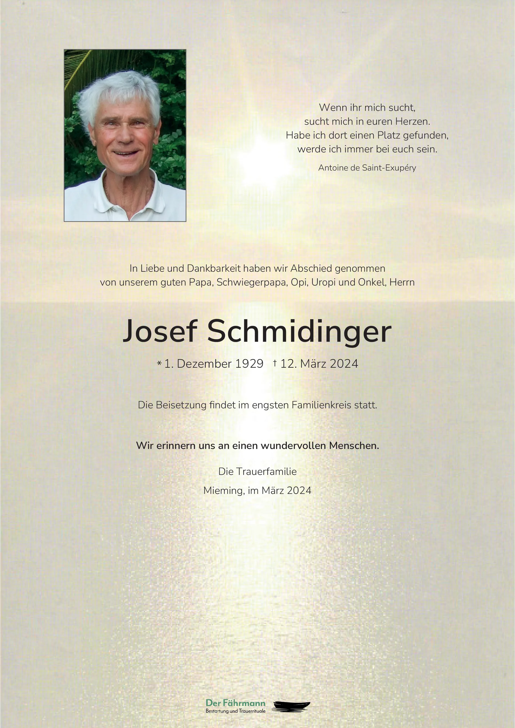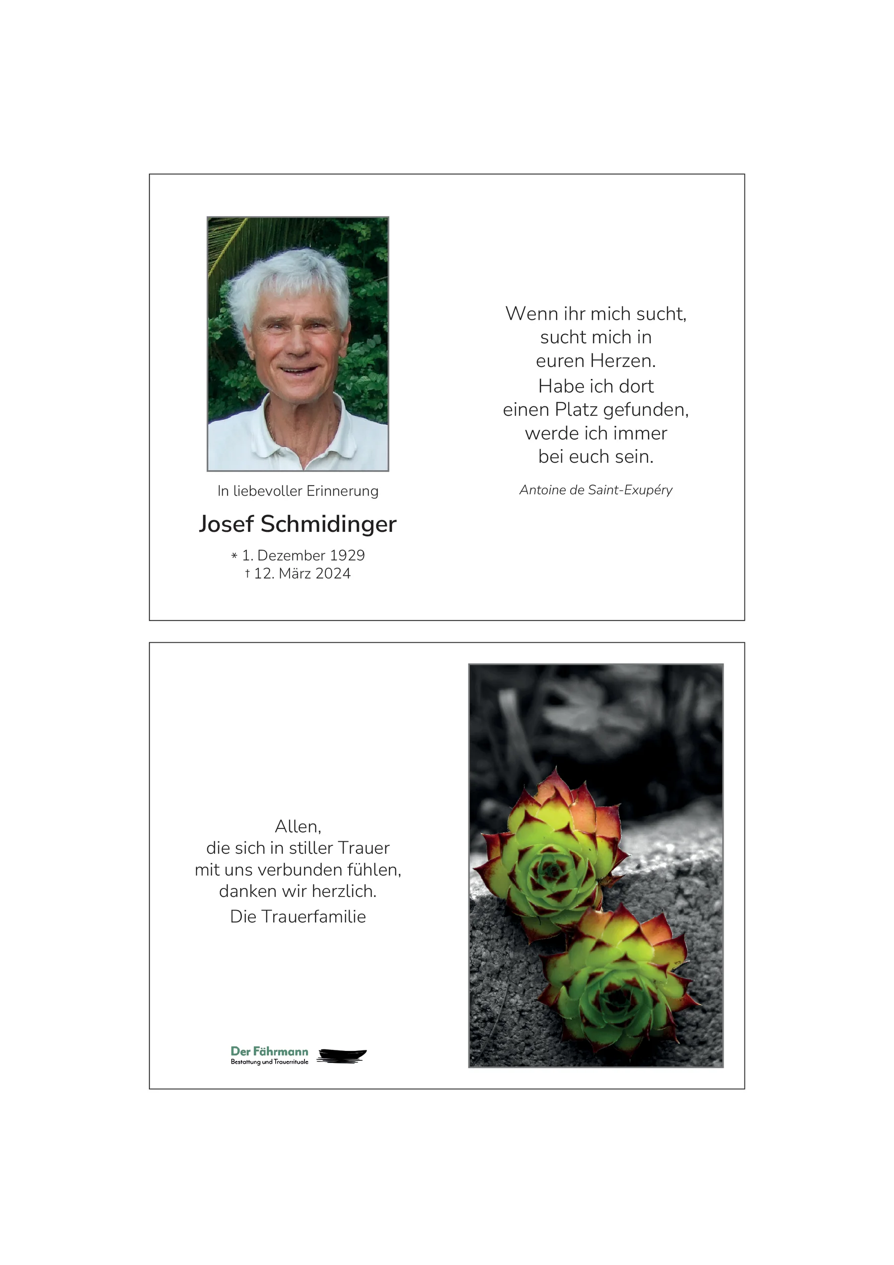 Josef Schmidinger 01.12.1929 12.03.2024 Mieming Parte Sterbebild Gedenkkerzen Kondolenzen Parte downloaden Sterbebild downloaden Gedenkkerzen für Josef Schmidinger 17 Einträge Kerze anzünden Ruhe in Frieden?️ Seniorengruppe " Sonnenstein" Sozialsprengel Mieminger Plateau Sepp und Lotte Falbesoner, Thiersee Toni u.Anna Falbesoner Hennersberg Fam. Schmidinger, Wörgl Ruhe in Frieden .Daniela Oberhofer Fam.Andrea und Hubert Pirpamer Ruhe in Frieden?️ Alfred Neurauter R.I.P Angelika und Reinhard Maurer Gute Reise Josef wünsch ich dir Bernhard Schöpfer Ruhe in Frieden! Burgi Widauer mit Familie Fa.Larcher Martin A Liachtle aus Nassereith ! ? Margret Zankai Eine gute Überfahrt - Bestattung "Der Fährmann" Eine Kerze für Josef Schmidinger Ihr Name* Ihre Nachricht oder Name* E-Mail-Adresse* Mit dem Klicken auf "Kerze anzünden" erklären Sie sich mit unseren Datenschutzbestimmungen einverstanden. Kondolenzbuch für Josef Schmidinger 0 Einträge Kondolenz verfassen Ihr Abschiedsgruß an Josef Schmidinger Ihr Name* E-Mail-Adresse* Ihre Nachricht* Mit dem Klicken auf "Gruß absenden" erklären Sie sich mit unseren Datenschutzbestimmungen einverstanden. Josef Schmidinger 01.12.1929 – 12.03.2024 Parte Sterbebild Gedenkkerzen Kondolenzen Kerze anzünden Kondolenz verfassen