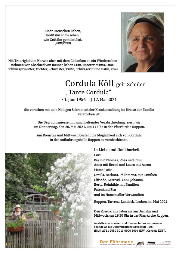 Tragt all die wertvollen und schönen Erinnerungen an eure Mama und eure "Tante Cordula" im Herzen - so wird sie für immer einen Platz in euren Herzen haben und unvergessen bleiben.