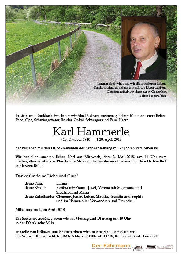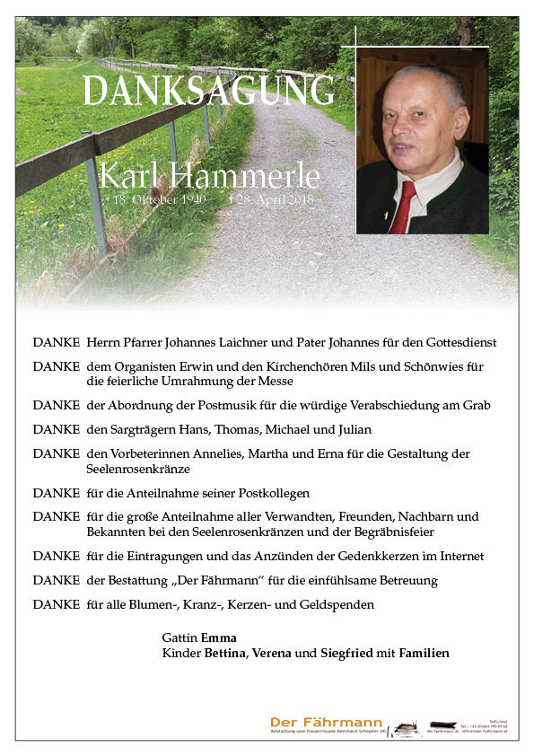 Lieber Karl ! habe heute deine Todesanzeige gelesen und war Tief Traurig darüber , ich wahr vor 35 Jahren der Lehrjunge auf deiner Baustelle damals du warst der beste Bauherr den ich je kennengelernt habe, auch danach als wir uns gesehen haben hattest du immer ein gutes Wort für mich ich kann gar nicht fassen das du nicht mehr da bist aber ich werde dich nie Vergessen mach es gut Karl wo immer du jetzt bist Andreas aus Nassereith