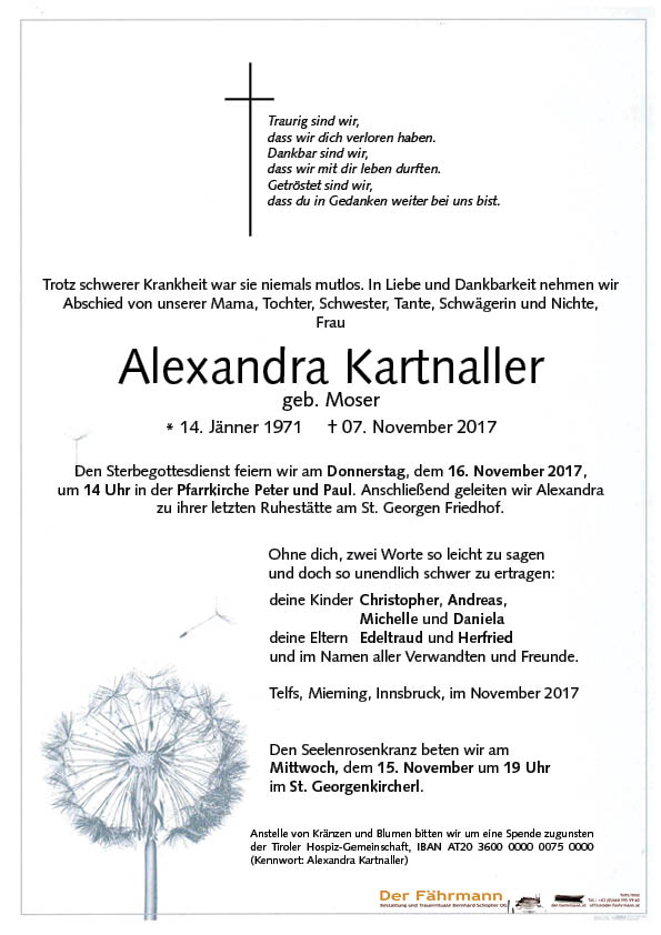 Liebe Familie! Ich hatte das Glück, eure Tochter und Mutter ein Stück ihres Weges zu begleiten. Sie war ein Engel auf Erden, der jetzt nach Hause gefahren ist und von oben wieder auf ihre Liebsten schauen kann <3 Ihre Familie <3 besonders <3 Christopher <3 Andreas <3 Michelle <3 und Daniela <3 Ihre Lieblingsthemen! Viel Kraft und Liebe euch Allen!