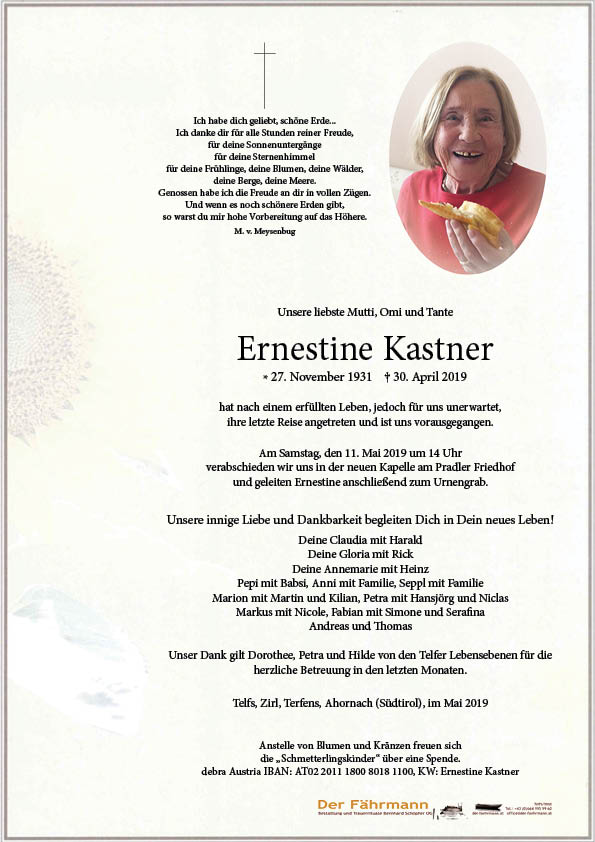 Kastner Ernestine 27.11.1931 30.04.2019 Telfs Beisetzungs-Ort: Friedhof Pradl Parte Gedenkkerzen Kondolenzen Parte downloaden Gedenkkerzen für Kastner Ernestine 30 Einträge Kerze anzünden Ruhe in Frieden Ruhe in Frieden Ruhe in Frieden Ruhe in Frieden Ruhe in Frieden Ruhe in Frieden Ruhe in Frieden Mein aufrichtiges Mitgefühl. Monika Herzliches Beileid, Emmi .... als flöge sie nach Hau, Beate mit Siegmund und Familie Ruhe in Frieden-Traudl und Leo Ich werde dich vermissen dein Neffe Pepi mit Babsi Wir sind jetzt bei euch. Caroline u. Franz Ein stiller Gruß - Barbara, Herbert & Denise Inge Mumelter Eva Pohl-Mumeler Eva Pohl-Mumeler In lieber Erinnerug Petra u. Hansjörg mit Niclas In stillem Gedenken. Heinz, Hildegard und Christian Reiter A Lichtl für Sie, liebe Frau Kastner - Christine Dablander In Lieber Erinnerung - Markus mit Nicole In Dankbarkeit und Liebe deine Annemarie mit Heinz In herzlicher Erinnerung an dich, dein Schwiegersohn Harald A Liachtl für die letzte Reise Luise Plattner A Liachtl für die letzte Reise Luise Plattner A Liachtl für die letzte Reise Luise Plattner Ich werde dich vermissen deine Marion mit Martin und Kilian In inniger Liebe und tiefer Verbundenheit ♡ dein Spatzl Wolfgang Köck eine gute Überfahrt Bestattung DER FÄHRMANN Eine Kerze für Kastner Ernestine Ihr Name* Ihre Nachricht oder Name* E-Mail-Adresse* Mit dem Klicken auf "Kerze anzünden" erklären Sie sich mit unseren Datenschutzbestimmungen einverstanden. Kondolenzbuch für Kastner Ernestine 2 Einträge Kondolenz verfassen Liebe Claudia, lieber Harald! Unser aufrichtiges Beileid zu eurem schwerem Verlust! Caroline u. Franz Caroline, Franz 06.05.2019 | 13:40 Uhr Mein herzliches Beileid Gruber Daniela 05.05.2019 | 14:40 Uhr Ihr Abschiedsgruß an Kastner Ernestine Ihr Name* E-Mail-Adresse* Ihre Nachricht* Mit dem Klicken auf "Gruß absenden" erklären Sie sich mit unseren Datenschutzbestimmungen einverstanden. Kastner Ernestine 27.11.1931 – 30.04.2019 Parte Gedenkkerzen Kondolenzen Kerze anzünden Kondolenz verfassen