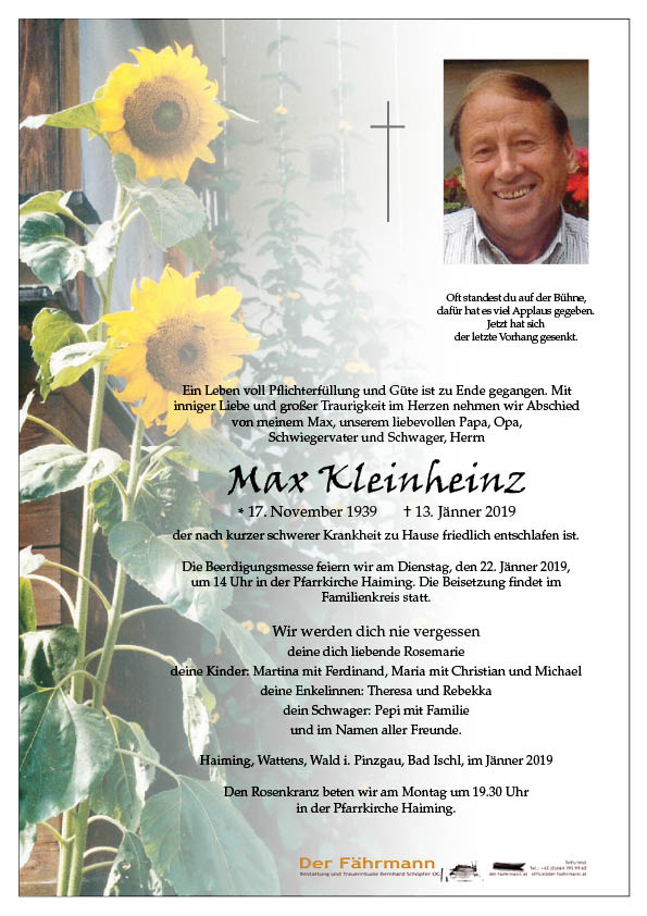 Herzliche Anteilnahme am Tod deines Mannes, eures Vaters, Opas und Schwiegervaters. Auch mir bleiben Erinnerungen an schöne Momente bei unserer gemeinsamen Zeit bei der Heimatbühne Haiming. Max war ein richtiger Vereinsmensch, sehr hilfsbereit und nett und so werde auch ich ihn in Erinnerung behalten.