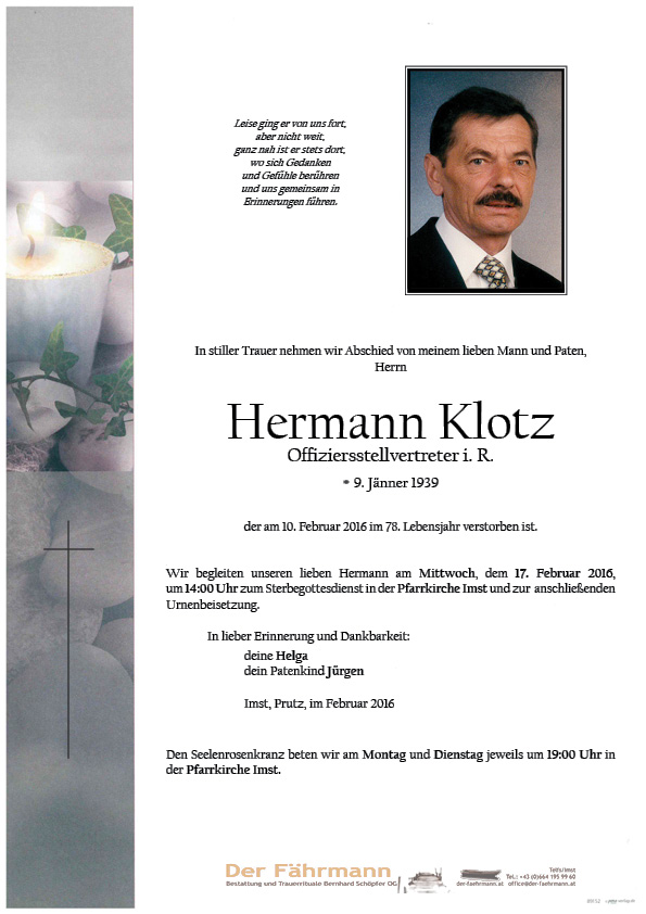Während meines Präsenzdienstes in Imst (1974/75)war Hermann einer meiner Ausbildner - und einer der bemerkenswertesten Menschen, die ich je kennen lernen durfte! Obwohl er unser Vorgesetzter war und der Ton in der Kaserne im allgemeinen nicht gerade zimperlich war, blieb er immer der Ruhepol und verlangte niemals Unmögliches von uns , vor allem nichts, was er nicht selber mitgemacht hätte. Er war stets fair und ausgesprochen höflich und hat sich mehr als einmal schützend vor uns gestellt, wenn von "weiter oben" Schikanen drohten. Wir waren alle jung und wollten am Wochenende nach Hause (meist nach Vorarlberg). Doch oft drohte man uns mit Strafdienst, wenn dieses oder jenes nicht so recht klappte, oder wenn uns gegenüber einfach nur Macht demonstriert werden sollte. Solche Dinge gab es bei Hermann Klotz nicht. Wenn etwas nicht passte, so bekamen wir die Chance, es richtig zu stellen - aber niemals mit Drohungen!