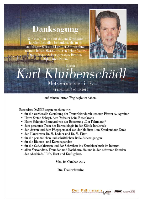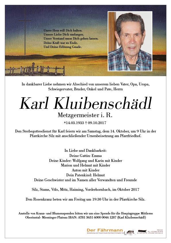 Nach einem langen, gut erfüllten Leben war’s nun auch Zeit für Dich, zu geh’n. Ein ruhiger Tod, so ist’s ein Segen, das können wir jetzt gut versteh’n. Ach, Opa, allen wirst Du fehlen! Die Enkel fragen, wo Du bist: »Tut er den Engeln Geschichten erzählen?« Ein schöner Gedanke – damit keiner vergisst! Deine dich immer im Herzen tragende Enkelin Elisabeth mit Stefan und Mario