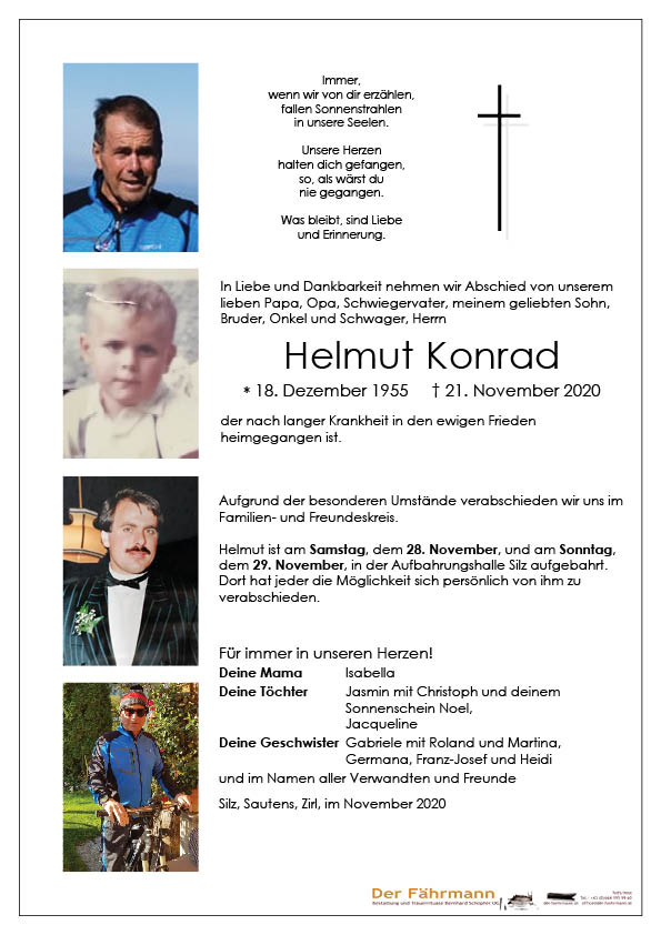 Liebe Familie Konrad .... gecondoleerd met het verlies van Helmut ! Als vader, zoon, broer, oom en opa ! Viel kraft erwunst fur die allen, heute en die kommende zeit ! Xxxx