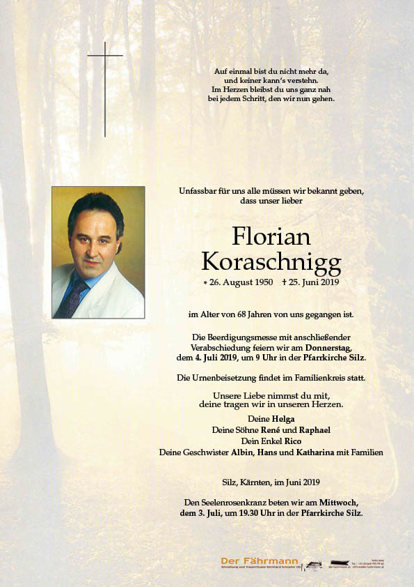 Koraschnigg Florian 26.08.1950 25.06.2019 Silz Beisetzungs-Ort: Friedhof Silz Aufbahrungs-Ort: am Mi., 3. Juli in der Aufbahrungshalle Silz Parte Gedenkkerzen Kondolenzen Parte downloaden Gedenkkerzen für Koraschnigg Florian 113 Einträge Kerze anzünden Ruhe in Frieden Krawina Heinz Ruhe in Frieden Krawina Heinz Ruhe in Frieden Wolfgang Köck Andrea und Hans-Peter Schuchter Manfred und Elisabeth Westreicher Dominik & Marika Erhart Renate und Karl Palfrader Brigitte mit Daniel und Marie In Osttirol brennt a a Kerzl für euren Papa. Monika mit Fam. Gerda und Johann Fröch mit Familie Ein Licht für deine Familie Ruhe in Frieden Betriebsrat Liebherr Manu Raffl (Ranacher) mit Fam. R.I.P. Christa, Günter und Kerstin Werner und Elfi Neurauter Fam. Haslwanter Hugo Fam. Helli und Regina Dablander Alfred u.Martha. Familie Kaltenegger Gabl Alfred R.I.P. Silvia und Richard Wille Conny Soraperra mit Fam. Ruhe in Frieden! Carina Walser R.I.P. - Fam. Adi Walser Familie C. Decristoforo In lieber Erinnerung, Celine In lieber Erinnerung Caroline mit Maria Fam.Rauch(Hirn) Gitti Johann und Herta Zauner Aufrichtige Anteilnahme, Simone Mein tiefstes Mitgefühl - Christine Dablander Herbert u. Barbara Götsch Aufrichtiges Beileid Erich Mitterwallner In stiller Anteilnahme Gottfried und Michaela Fam Pepi u Ilse Huter Ruhe in Frieden Fam Karin Rigger unser mitgefühl seiner familie! adieu, lieber florian! Irmgard Thumer Fam. Krinzinger fam. Krawina Andrea Föger mit Fam. herzliche Anteilnahme Fam.MarionWalch(Kluibenschädl) Unsere aufrichtige Anteilnahme! Fam. Groh Heidi Ciresa Hannelore und Walter leitner Roland u Irmgard Witsch mit Anna Sophia u Laura Fam. Walder Fam. Mareiler Bruno bachnetzer andreas mit sabine Herma Stefanie u. Denise Aufrichtige Anteilnahme Toni Walser mit Familie Sabine und Helmut Zoller Werner u. Klara Gabl Sabine Föger mit Familie Unser aufrichtiges Beileid! Peer Maria mit Claudia & Andreas Unser aufrichtiges Beileid. Fam. Strigl Fam. Tria Wammes Ferdinand mit Familie Familie Karl und Petra Mareiler Gute Reise, Deine Liebherr Kollegen Schrott Michael und Brigitte mit Familie Ruhe in Frieden. Fleischhacker Rosmarie Regina u. Volker Burger Regina u. Volker Burger Aufrichtiges Beileid Burgi Tini mit Inoe und Elias Erna und Lois Wille Matthias, Benjamin und Gabriel Floriani Raphael und Silvia Floriani Ruhe in Frieden! Marina und Hermann Floriani Unser aufrichtiges Beileid, liebe Helga! Fam. Zobl In Gedanken bei der Familie wünschen wir Kraft Mandy mit F Aufrichtiges beileid hermine Unser aufrichtiges Beileid! Manuel und Petra mit Niklas Aufrichtiges Beileid , Brigitta und Peter Unser Beileid! Praxmarer Daniel und Bettina A Liacht‘l für die Familie Ein Licht für deine Reise. Tamara und Martin mit Elina und Nevio Eva und Günter Neurauter Viel Kraft für die Familie Fam. Nadja Reindl Mein Beileid! Bianca Wagner Viel Kraft liebe Helga. Franziska und Gerfried Andrea Föger mit Familie Dietmar Doris Dablander mit Familie Paula und Hans Fam. Pohl Herta und Erich Fam. Fröch Barbara und Gerhard Mein Beileid! Anna Pfausler mit Familie Ruhe in Frieden Aufrichtige Anteilnahme! Familie Groh Fam.Kopp Manuela Ich werde dich nie vergessen. Ich liebe dich Papa Ruhe in Frieden! Aufrichtiges Beileid Marcel Westerthaler Ruhe in Frieden Franz Josef Perwög und Marlies Aufrichtiges Beileid... Toni und Astrid Klotz Gute Reise Fam. Richard Bachnetzer Ruhe in Frieden Alex u Andreas mit Fam Ruhe in Frieden Kluibenschädl Anton Wolfgang Köck Kluibenschädl Anton Ruhe in Frieden. Paula Aufrichtiges Beileid Karlheinz und Brigitte Christine Dablander, Telfs Mein aufrichtiges Beileid!! Gabi Gurschler - Wammes eine gute Überfahrt Bestattung DER FÄHRMANN Eine Kerze für Koraschnigg Florian Ihr Name* Ihre Nachricht oder Name* E-Mail-Adresse* Mit dem Klicken auf "Kerze anzünden" erklären Sie sich mit unseren Datenschutzbestimmungen einverstanden. Kondolenzbuch für Koraschnigg Florian 0 Einträge Kondolenz verfassen Ihr Abschiedsgruß an Koraschnigg Florian Ihr Name* E-Mail-Adresse* Ihre Nachricht* Mit dem Klicken auf "Gruß absenden" erklären Sie sich mit unseren Datenschutzbestimmungen einverstanden. Koraschnigg Florian 26.08.1950 – 25.06.2019 Parte Gedenkkerzen Kondolenzen Kerze anzünden Kondolenz verfassen