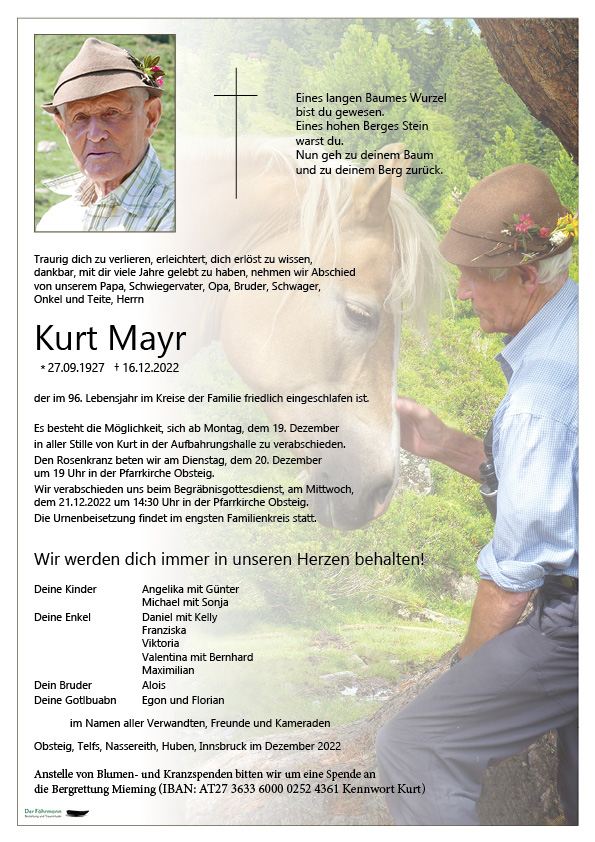 In deinem Leben hast du etliche Berggipfel bestiegen, sämtliche Hüttenwirte und Hirten mit deinen Sprüchen erfreut. Du warst immer ein gerngesehener Gast. Nun hast du deinen letzten Gipfel erklommen und deine Sprüche werden die Gemüter im Himmel ziemlich aufmischen. Wir wünschen dir ein gutes Heimkommen und werden dich in lieber Erinnerung behalten.