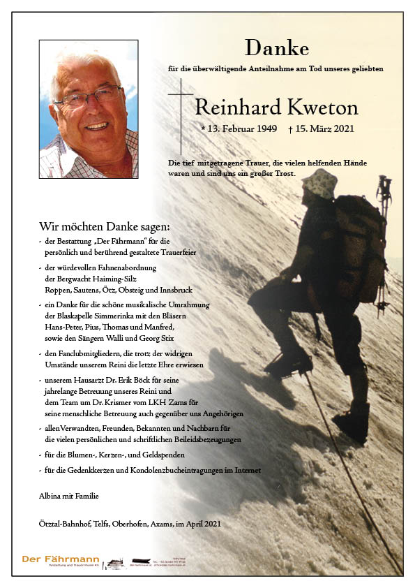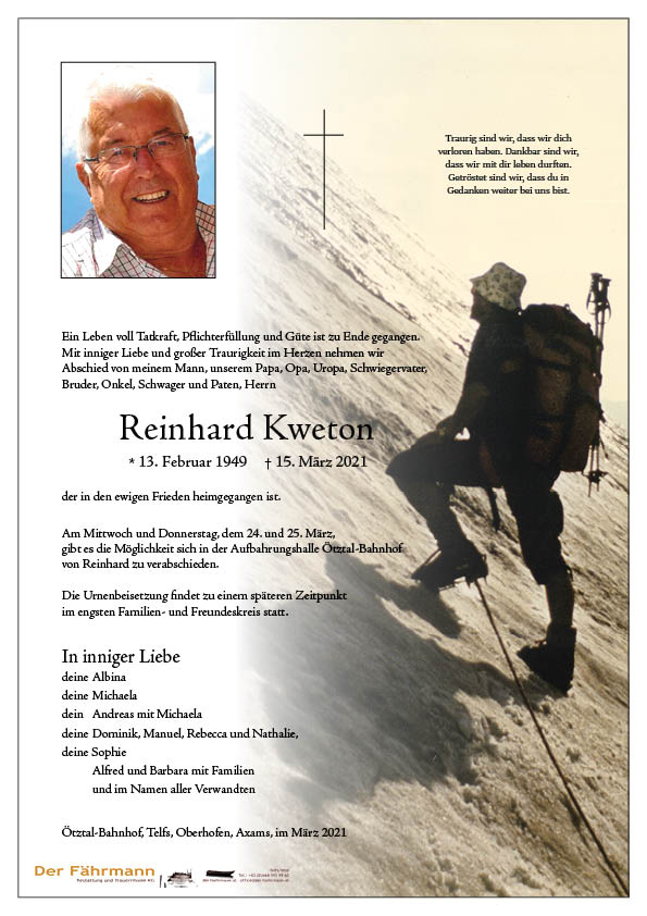 Aufbahrungs-Ort: am Mi, dem 24. März ab 10 Uhr, bis Do., dem 25. März, in der Aufbahrungshalle Ötztal-Bahnhof