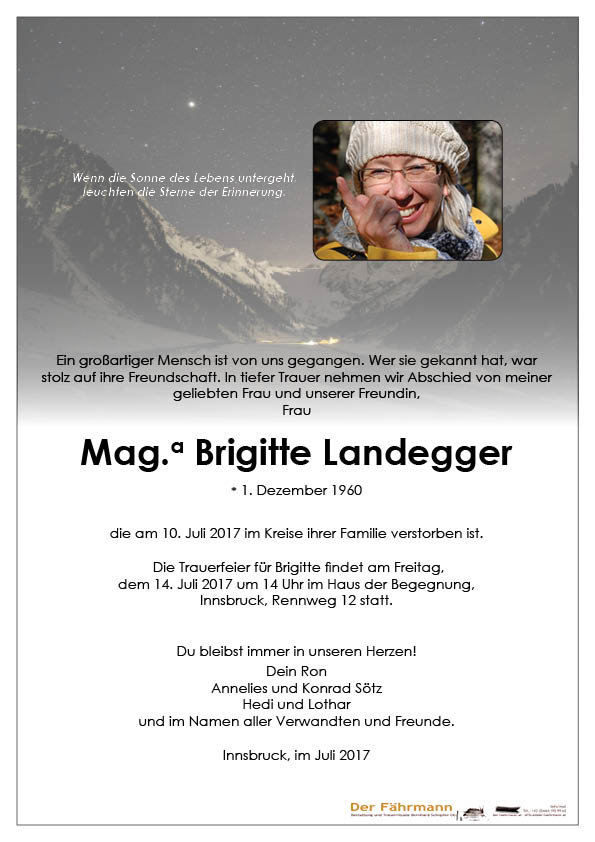 Wer Frau Brigitte Landegger kannte weiss was wir für einen wunderbaren Mensch wir verloren haben!Ich werde Sie nie vergessen! Danke für alles, Marion...