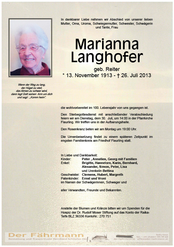 Langhofer Marianna 13.11.1913 26.07.2013 Flaurling Beisetzungs-Ort: Flaurling Parte Gedenkkerzen Kondolenzen Parte downloaden Gedenkkerzen für Langhofer Marianna 0 Einträge Kerze anzünden Eine Kerze für Langhofer Marianna Ihr Name* Ihre Nachricht oder Name* E-Mail-Adresse* Mit dem Klicken auf "Kerze anzünden" erklären Sie sich mit unseren Datenschutzbestimmungen einverstanden. Kondolenzbuch für Langhofer Marianna 0 Einträge Kondolenz verfassen Ihr Abschiedsgruß an Langhofer Marianna Ihr Name* E-Mail-Adresse* Ihre Nachricht* Mit dem Klicken auf "Gruß absenden" erklären Sie sich mit unseren Datenschutzbestimmungen einverstanden. Langhofer Marianna 13.11.1913 – 26.07.2013 Parte Gedenkkerzen Kondolenzen Kerze anzünden Kondolenz verfassen