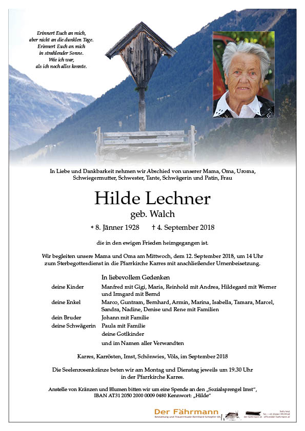 Eure Mama und Oma hatte in ihrem Leben viele wunderbare Ereignisse, aber auch schwere Zeiten und viele Aufgaben mit einer großen Familie. Nach einem erfüllten Leben darf sie jetzt hinübergehen in ein neues Leben bei Gott.