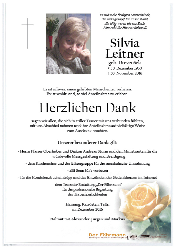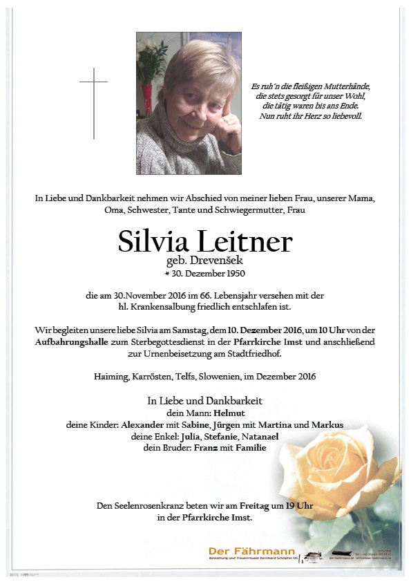 Wir möchten euch auf diesem Wege unser aufrichtiges Beileid ausdrücken. Eure Mama möge in Frieden ruhen.