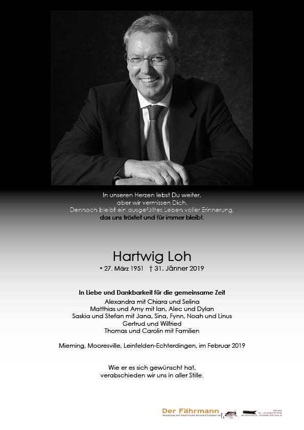 mit Hartwig Loh verbindet mich eine schöne Zeit im Stuttgarter Berufsleben. Wir haben unsere freundschaftliche Verbindung nie verloren. Umso mehr bin ich erschüttert von seinem Tod und trauere mit Ihnen! Er wird auch bei mir im Herzen eine schöne Erinnerung sein.