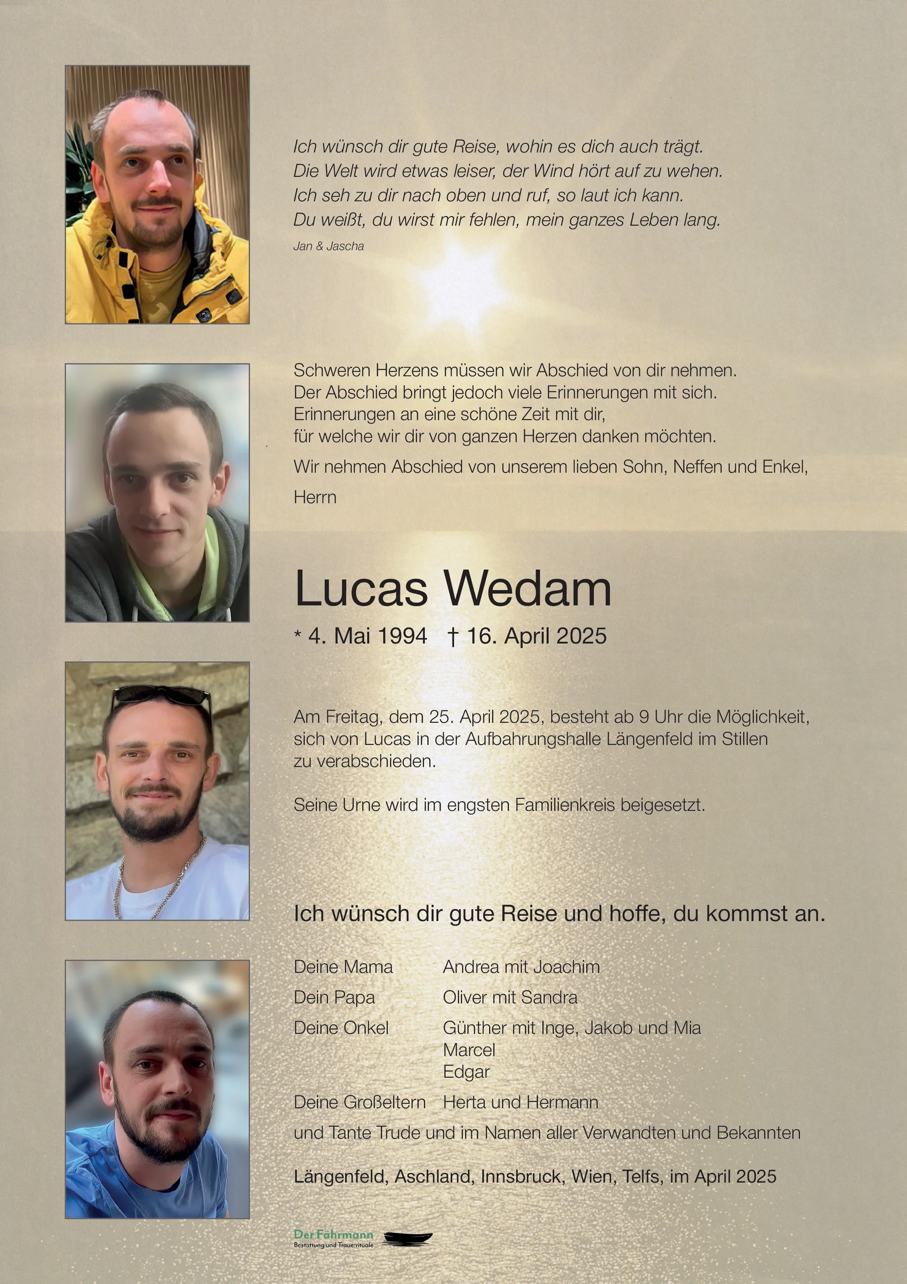 Lucas danke für die schöne Zeit mit Dir.Du warst für mich wie ein Sohn leider hat Dich das Schicksal viel zu früh aus unserer Mitte gerissen aber Du wirst in unserem Herzen ♥️ weiterleben. Gute Reise Joachim