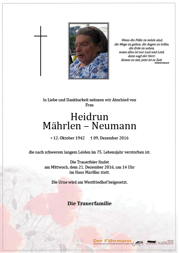 Mährlen – Neumann Heidrun 12.10.1942 09.12.2016 Beisetzungs-Ort: Friedhof Wilten West Parte Gedenkkerzen Kondolenzen Parte downloaden Gedenkkerzen für Mährlen – Neumann Heidrun 9 Einträge Kerze anzünden Ruhe in Frieden Wolfgang Köck Du warst eine wundervolle Frau liebe Heidrun. Alena The Taweel Family Dein Bruder Knut und Familie sind in Gedanken bei Dir! Ruhe in Frieden Ich denk an dich - Barbara Ruhe in Frieden eine gute Überfahrt „Bestattung DER FÄHRMANN“ Eine Kerze für Mährlen – Neumann Heidrun Ihr Name* Ihre Nachricht oder Name* E-Mail-Adresse* Mit dem Klicken auf "Kerze anzünden" erklären Sie sich mit unseren Datenschutzbestimmungen einverstanden. Kondolenzbuch für Mährlen – Neumann Heidrun 0 Einträge Kondolenz verfassen Ihr Abschiedsgruß an Mährlen – Neumann Heidrun Ihr Name* E-Mail-Adresse* Ihre Nachricht* Mit dem Klicken auf "Gruß absenden" erklären Sie sich mit unseren Datenschutzbestimmungen einverstanden. Mährlen – Neumann Heidrun 12.10.1942 – 09.12.2016 Parte Gedenkkerzen Kondolenzen Kerze anzünden Kondolenz verfassen