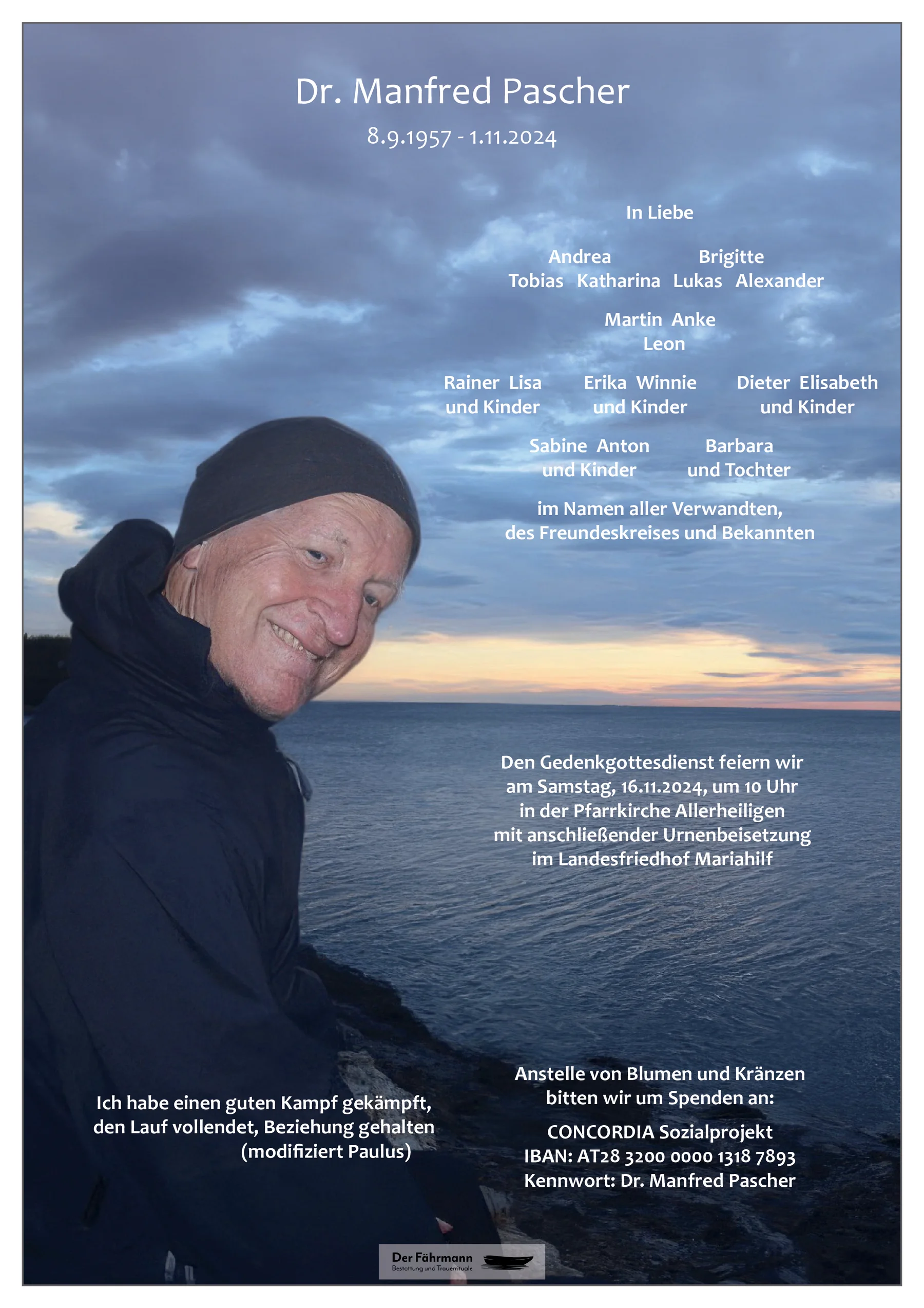 Lieber Herr Dr. Pascher! Über viele Jahre haben sich unsere Wege beinahe täglich in der Sonnenstraße gekreuzt, und es war immer eine Freude, Ihnen zu begegnen! Danke für Ihre gute Laune! Dass es jetzt so schnell gegangen ist, tut mir sehr leid. Ich werde Sie in lieber Erinnerung behalten.