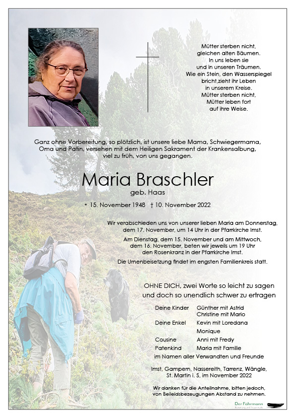 Mit Entsetzen und tiefer Traurigkeit……habe ich gestern von plötzlich Tod eurer Mama gehört, es tut mir unendlich Leid das ihr so einen Schmerz erdulden müsst, ich bete für Maria das sie ewig Heimat findet und beim Papa gut an kommt und für euch bete ich das der liebe Gott euch Kraft, Trost und Zuversicht gibt auf den schmerzlichen Weg der Trauer …….wenn ihr Hilfe braucht meldet euch bitte, die Mama war für mich auch immer da …….fühlt euch gedrückt und umarmt…….einfach unfassbar